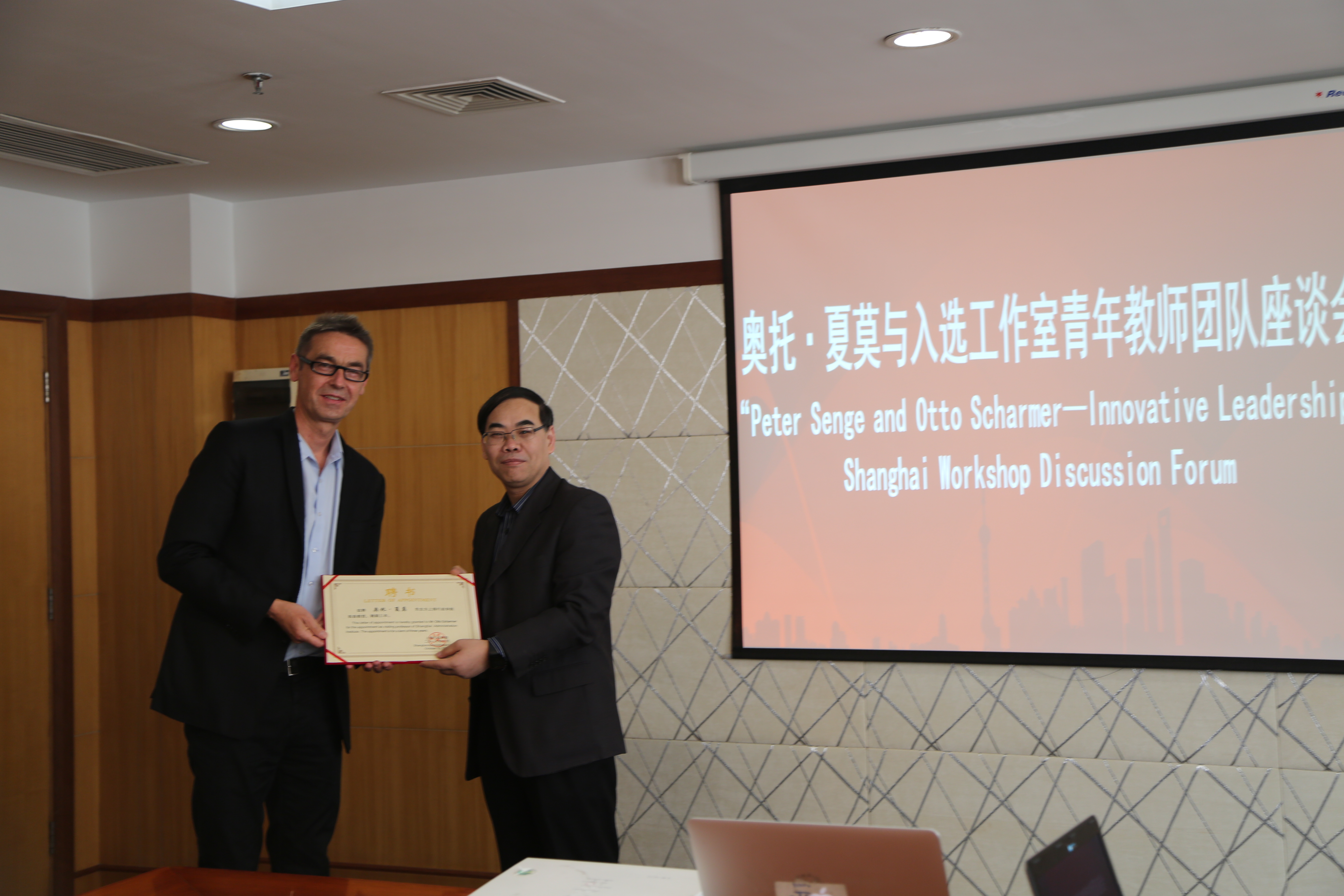 On December 9, Shanghai Administration Institute (SAI) held a ceremony to appoint Otto Scharmer, a famous scholar of MIT, co-founder of the Presencing Institute and founder of Theory U, as a visiting professor of Peter Senge & Otto Scharmer Innovative Leadership Shanghai Workshop of SAI. Vice President ZENG Jun attended the appointment ceremony and presented him the letter of appointment. The ceremony was presided over by the Training Division Director TU Ye. Otto Scharmer’s team, young teachers of the workshop and personnel in charge of international cooperation projects of Cadre Education Office of the Organization Department of CPC Shanghai Municipal Committee attended the ceremony.