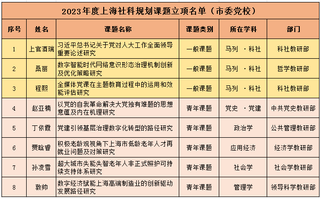 近日,上海市社科规划办公布了2023年市社科规划年度课题立项名单,我校(院)中标8项年度课题(含一般课题3项、青年课题5项),区委党校中标6项(含一般课题1项、青年课题3项、自筹课题2项)。
