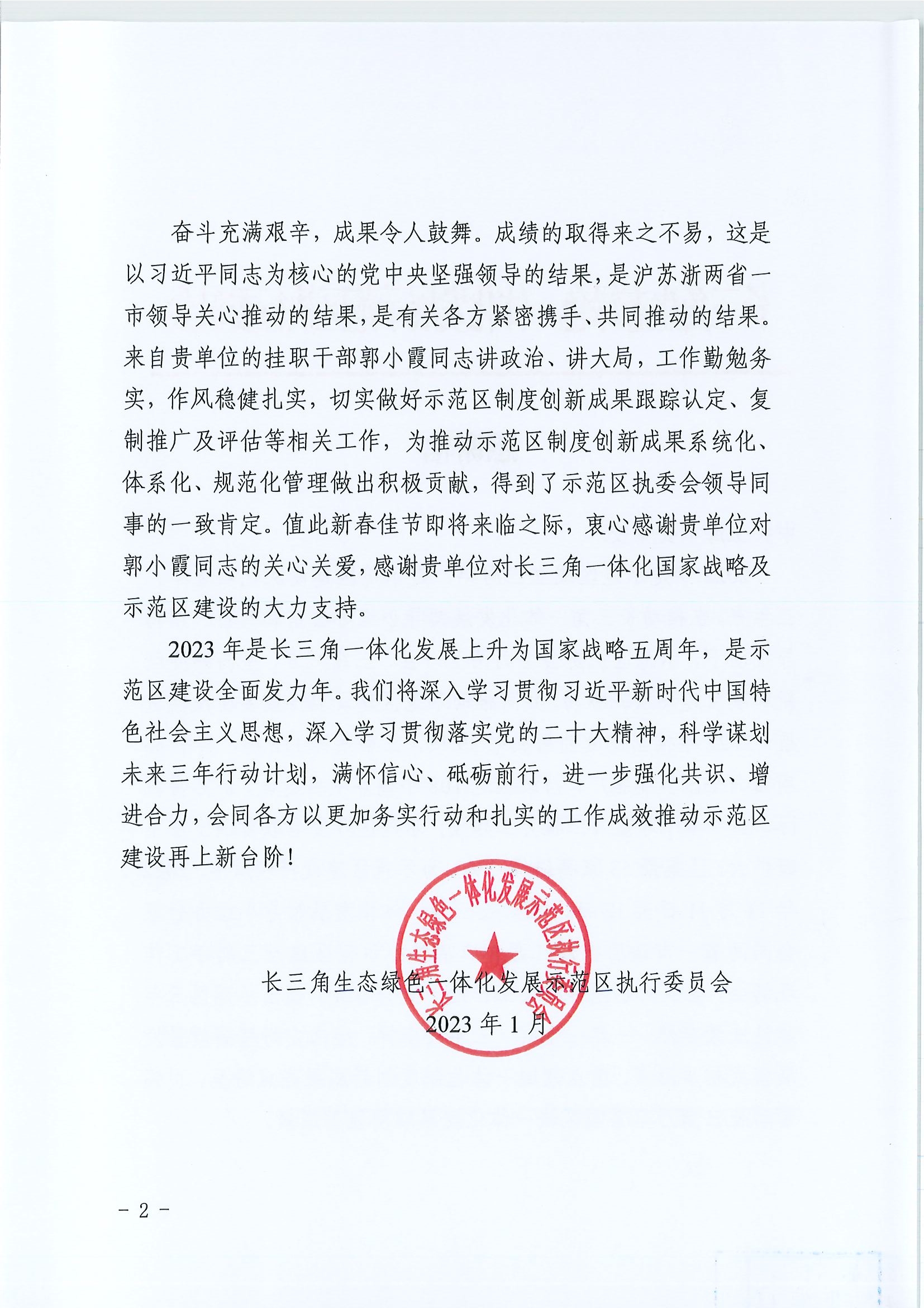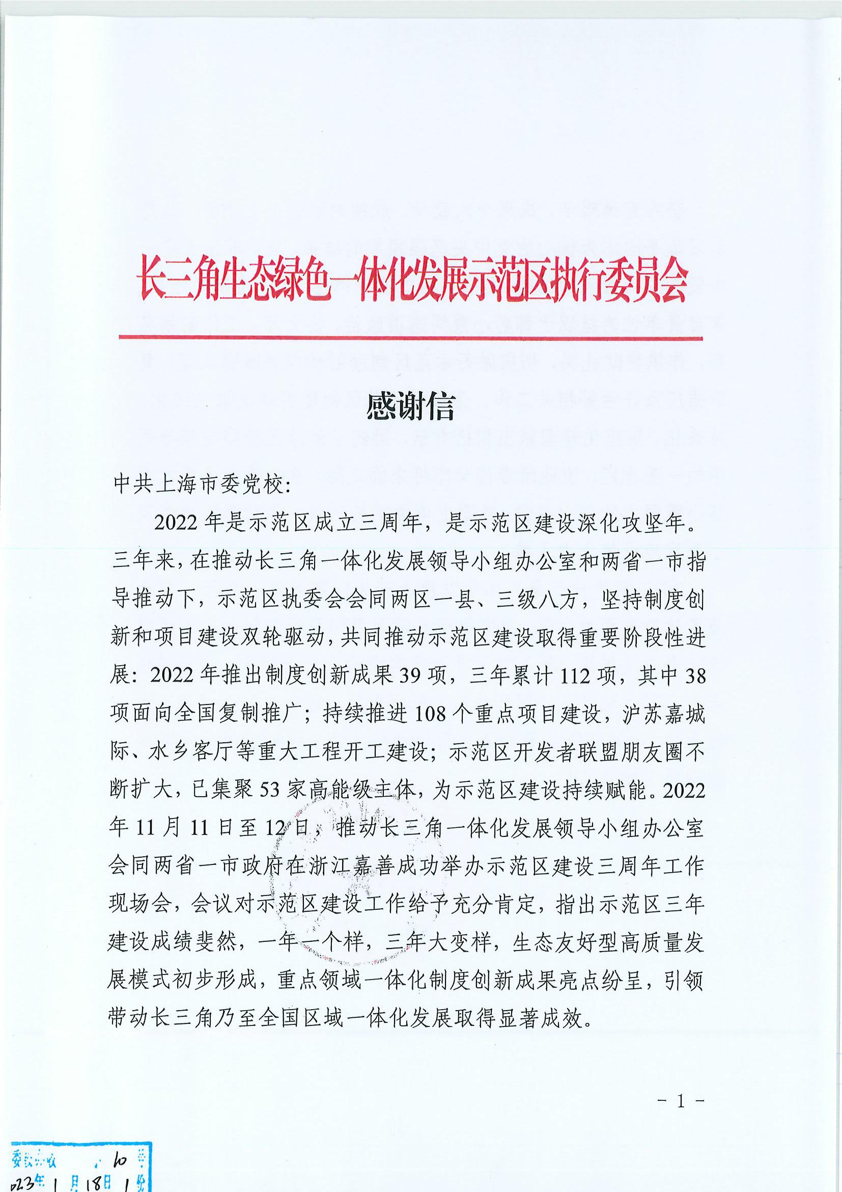 近日,长三角生态绿色一体化发展示范区执行委员会致信我校,感谢科研处副处长郭小霞挂职期间的突出业绩,感谢我校对长三角一体化国家战略及示范区建设的大力支持。郭小霞同志讲政治、讲大局,工作勤勉务实,作风稳健扎实,切实做好示范区制度创新成果跟踪认定、复制推广及评估等相关工作,为推动示范区制度创新成果系统化、体系化、规范化管理做出积极贡献,得到了示范区执委会领导和同事的一致肯定。