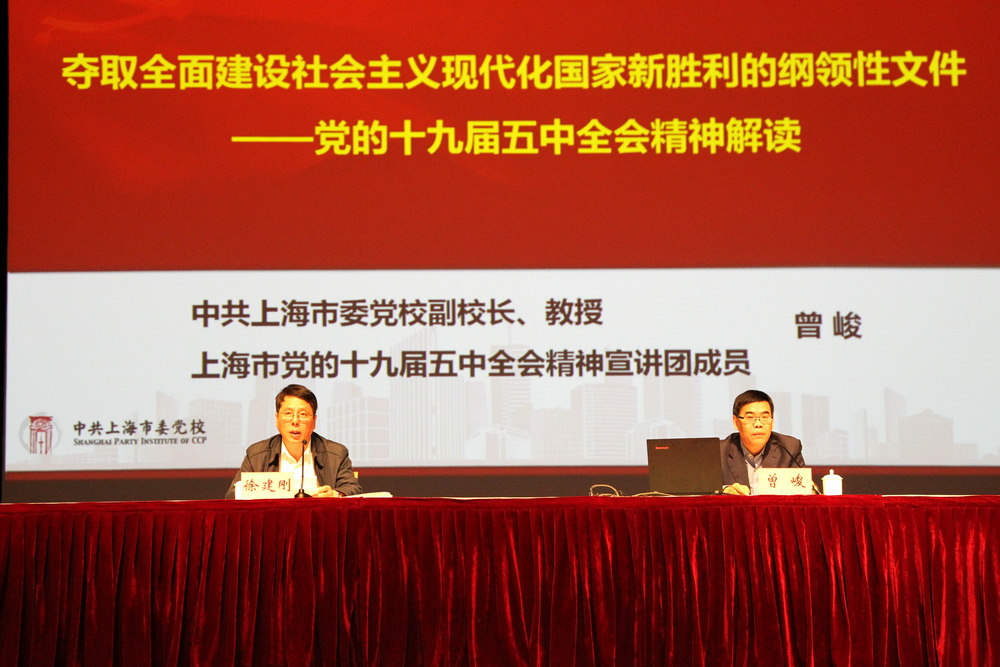 本网讯 11月17日,市委党校(上海行政学院)深入学习贯彻党的十九届五中全会精神专题辅导报告会在党校大礼堂举行。辅导报告会由常务副校(院)长徐建刚主持,副校(院)长、上海市学习贯彻党的十九届五中全会精神宣讲团成员曾峻主讲。校处两级中心组成员、市纪委派驻纪检组工作人员在前排就坐。全体在职党员及研究生党员共400多人参加。