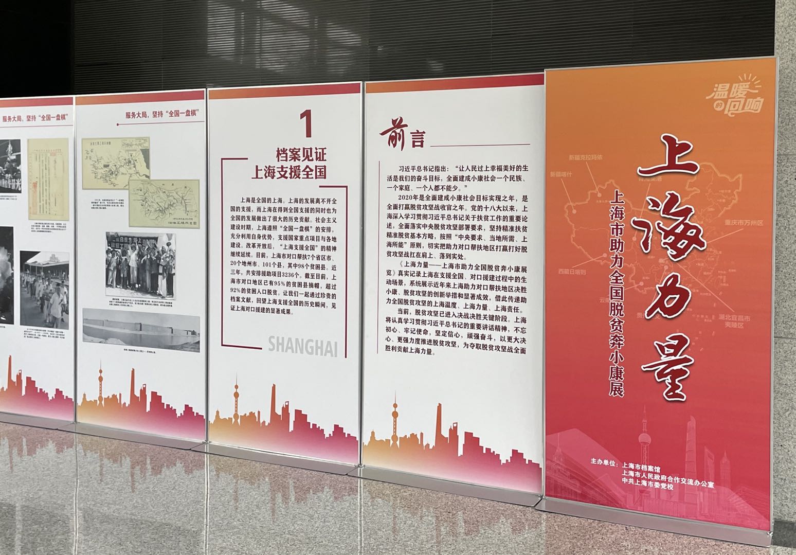 本网讯 11月12日,市档案馆、市人民政府合作交流办公室与市委党校联合举办的“上海力量——上海市助力全国脱贫奔小康展”在我校海华教学楼完成布展。展览名称“上海力量”来源于我校“上海参与东西部扶贫协作和对口支援精神品格研究”项目组的研究成果《上海力量——对口援建的精神品质和实践创新》。