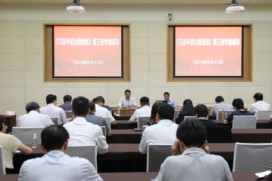 本网讯 根据党中央决策部署和市委工作要求,结合“四史”学习教育工作安排,8月25日上午,校(院)举行《习近平谈治国理政》第三卷专题学习会。常务副校(院)长徐建刚主持学习会并对深入开展《习近平谈治国理政》第三卷的学习贯彻进行了部署。校(院)马克思主义学院常务副院长王公龙教授作专题辅导。全体校委委员在主会场海兴大厦201会议室第一排就坐。在职党员共400余人分散在12个会场参会。市纪委驻市委组织部纪检组和教学督导组成员也参加了学习。