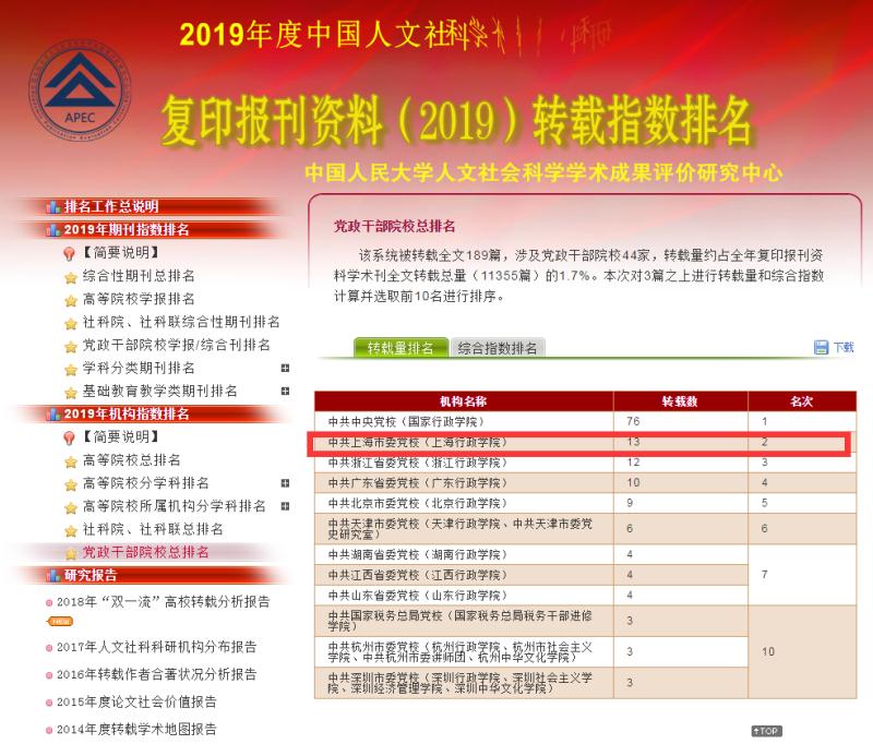 本网讯 近日,中国人民大学人文社会科学学术成果评价研究中心发布了复印报刊资料(2019)转载指数排名。2019年,我校共有13篇论文被复印资料转载。在党政干部校院总排名中,我校转载量排名和综合指数排名仅次于中共中央党校(国家行政学院),均位列全国省级党校第一,排名和上一年度持平。