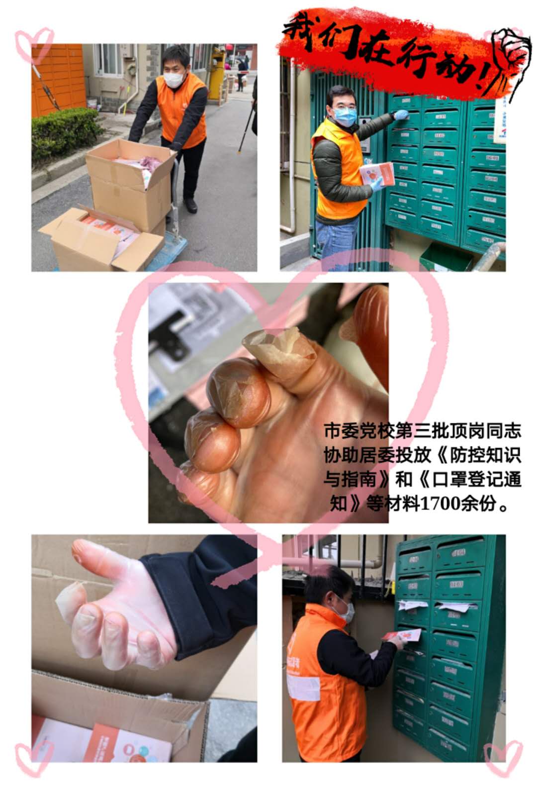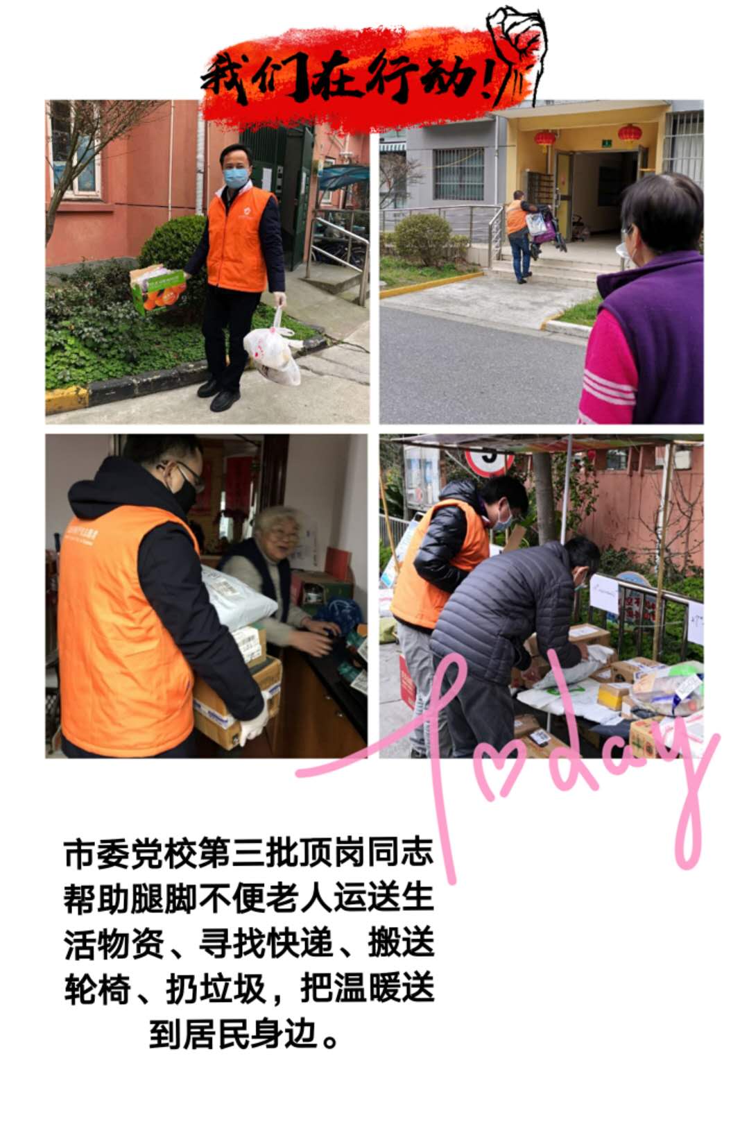 在做好防控基本工作的同时,顶岗人员积极协助居民和快递小哥查找快递包裹,帮忙梳理堆积的快递,给行动不便的老人送快递;有的发挥特长,给居委会关于双老家庭养老难题的解决出谋划策;有的还指路带路。大家觉得,在这个特殊时刻,做些服务是应该做的,也是应该做好的。下班感觉酸爽一点,仍感到很开心、值得。
