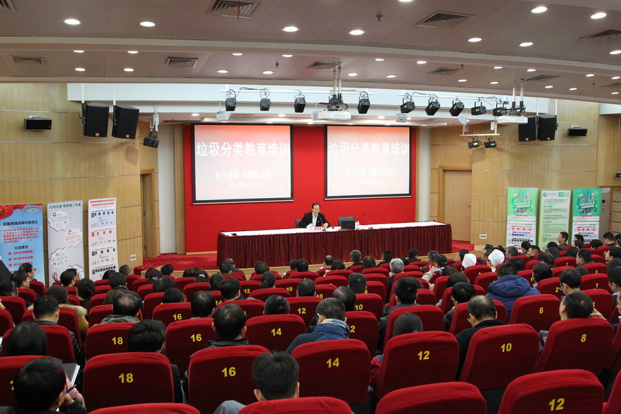 本网讯 3月6日下午,我校举办“垃圾分类”培训暨主题党日活动。副校院长朱亮高主持并讲话。市绿化市容局政策法规处王辉副处长、徐汇区绿化市容局曹丹俊应邀来校从政策法规和实务操作两个层面做讲座。有关支部党员代表和后勤工作人员近300人参加。