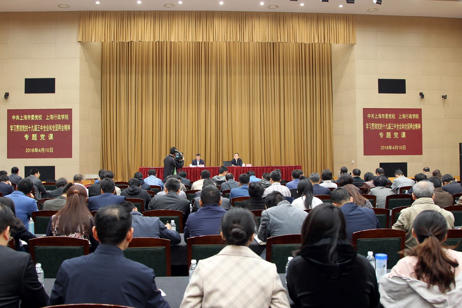 本网讯 4月10日上午,校院举行学习贯彻十九届三中全会和全国两会精神专题党课,由副校院长郭庆松做“深化党和国家机构改革是推进国家治理现代化的一场深刻变革”的辅导报告。副校院长李渤主持,校院近300名党员参加。