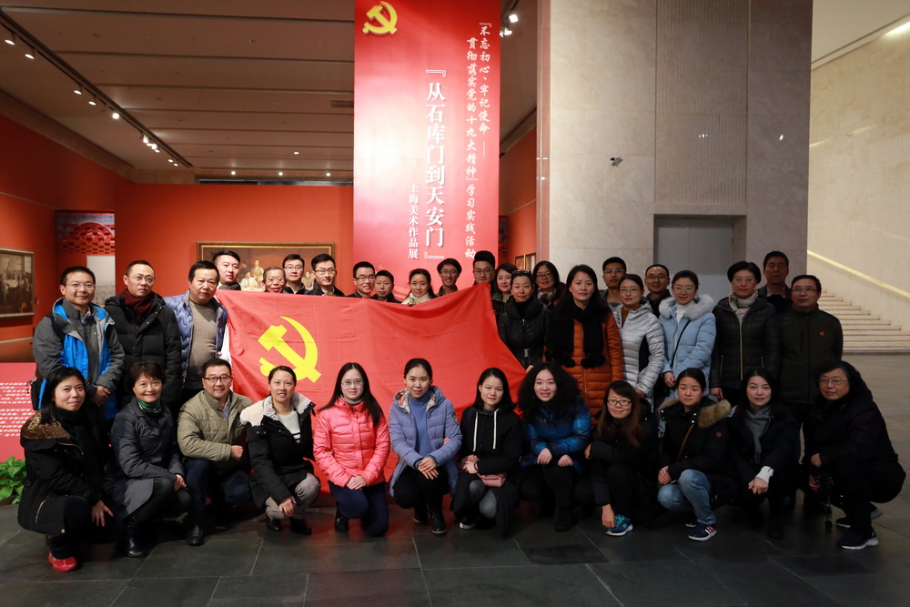 默念着赵丽宏的诗句:“打开历史的大门,听岁月涛声,寻播种者屐痕”,党员们依次走进石库门、窑洞门、天安门、复兴之门,感受着中国共产党诞生以来的四个重要历史阶段。从体现中共一大召开场景的油画作品,到表现南昌起义、抗日战争、上海解放、改革开放等一系列重大历史事件的作品,从吴湖帆、陆俨少、刘海粟、林风眠、程十发等老一辈艺术家的经典之作,到“80后”美术界新锐的优秀新作,在艺术家或细致或豪放但都包含深情的笔触中,党员们感受到一代代艺术家心系家国、放歌时代的赤子之心。党员们为“播火者坚定的脚步”而赞叹,激动于革命前辈的“理想之光”,体验着“历史在这里揭开光明的初页。光,在门内聚集,又从这里向世界辐射”的无上荣光,也为自身作为党员、作为党的诞生之地党校的一员而倍感自豪。
