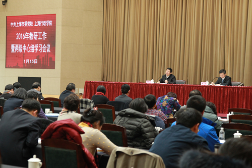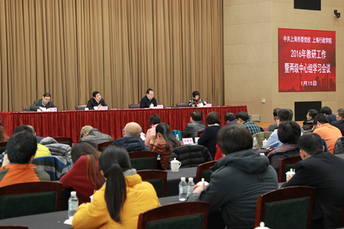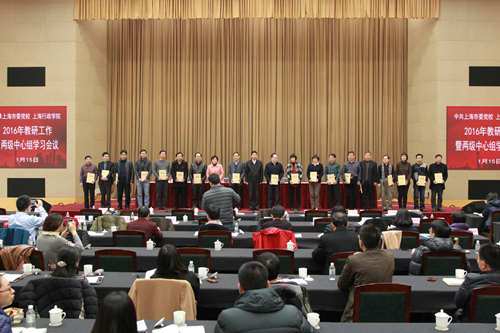 本网讯 1月15日下午,中共上海市委党校、上海行政学院2016年教研工作暨两级中心组学习会议在海华101报告厅举行。会议的前半部分由教育长梅丽红主持,副校院长曾峻、郭庆松分别总结了2015年教学科研情况,并对2016年教学科研工作进行了部署,常务副校院长王国平代表校院向新一届学术委员会委员颁发了聘书。会议的后半部分由副校院长李渤主持,常务副校院长王国平传达了全国党校工作会议精神。总校分校副处以上干部与总校全体教师共200余人参加了学习会议。