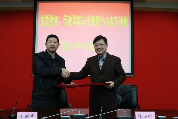 本网讯 12月21日,常务副校院长王国平与市外办主任张小松签署校院与市外办友好协议书。这是校院第一次同大口委办签署友好合作协议书。校院副校院长郭庆松,校委委员、副巡视员李宁出席。组织人事处、教务处、培训处和外事处等部门负责人,及市外办领导和各处室负责人共同出席见证签字仪式。
