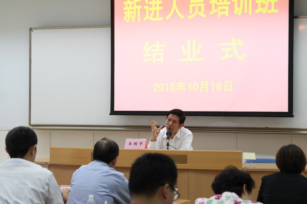 本网讯 为使新进人员尽快熟悉干部教育培训的规律和特点,把握校院教学科研咨询管理基本要求,系统掌握校院五大战略,10月14日至16日,校院举办了2015年新进人员培训班。10名新进参公人员和6名青年教研人员参加培训。常务副校长王国平出席结业式并为新进人员颁发了结业证书。