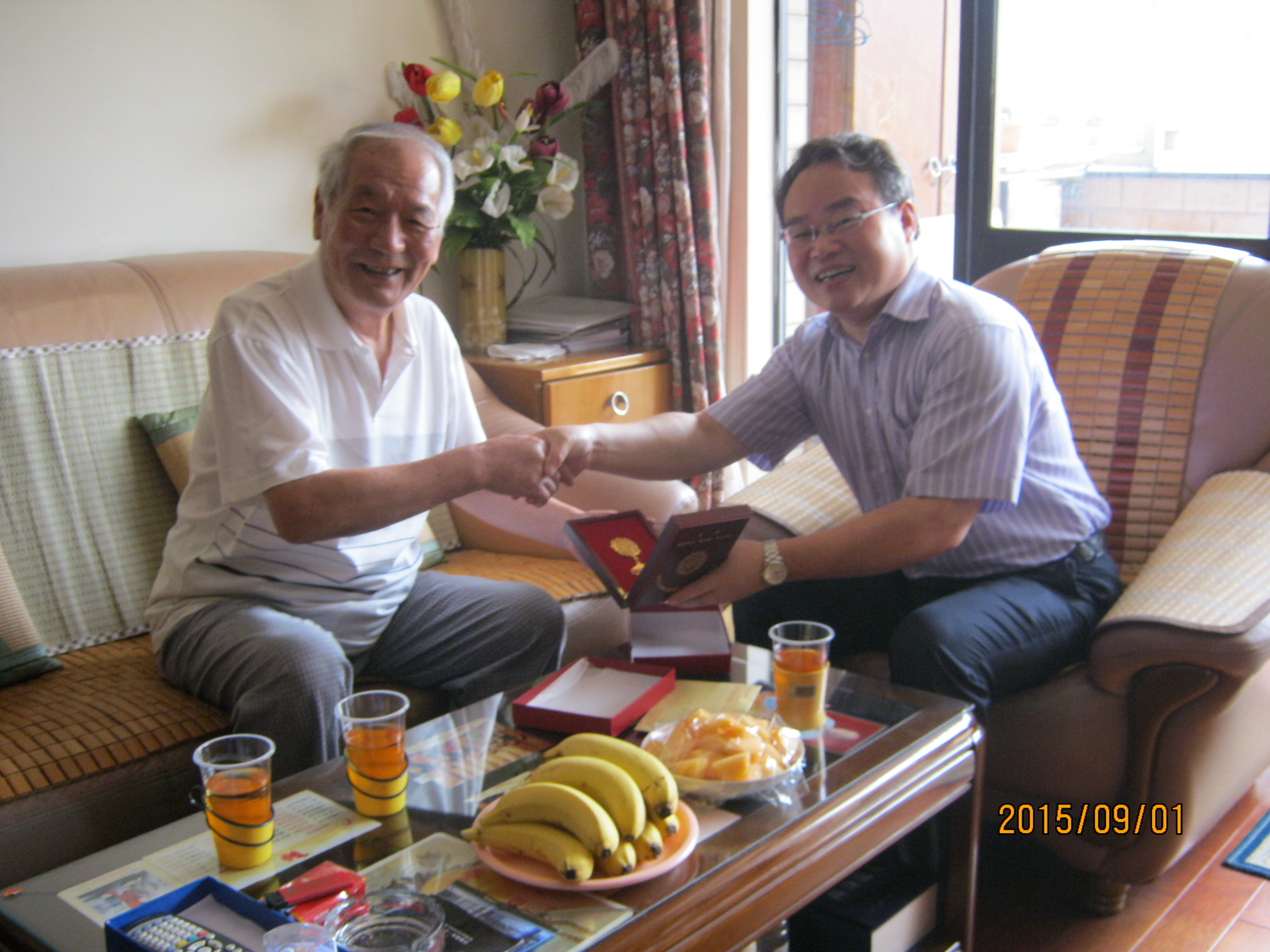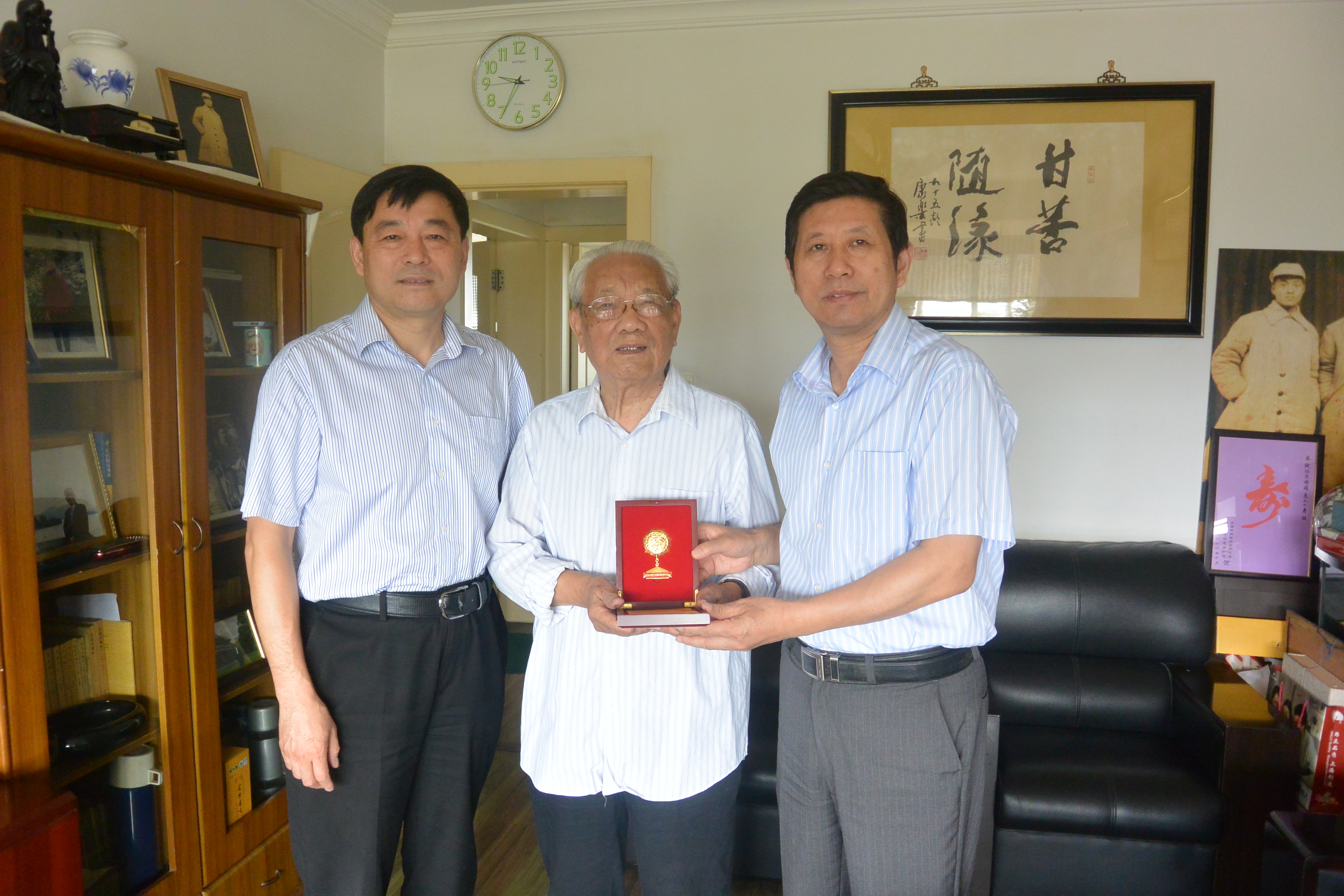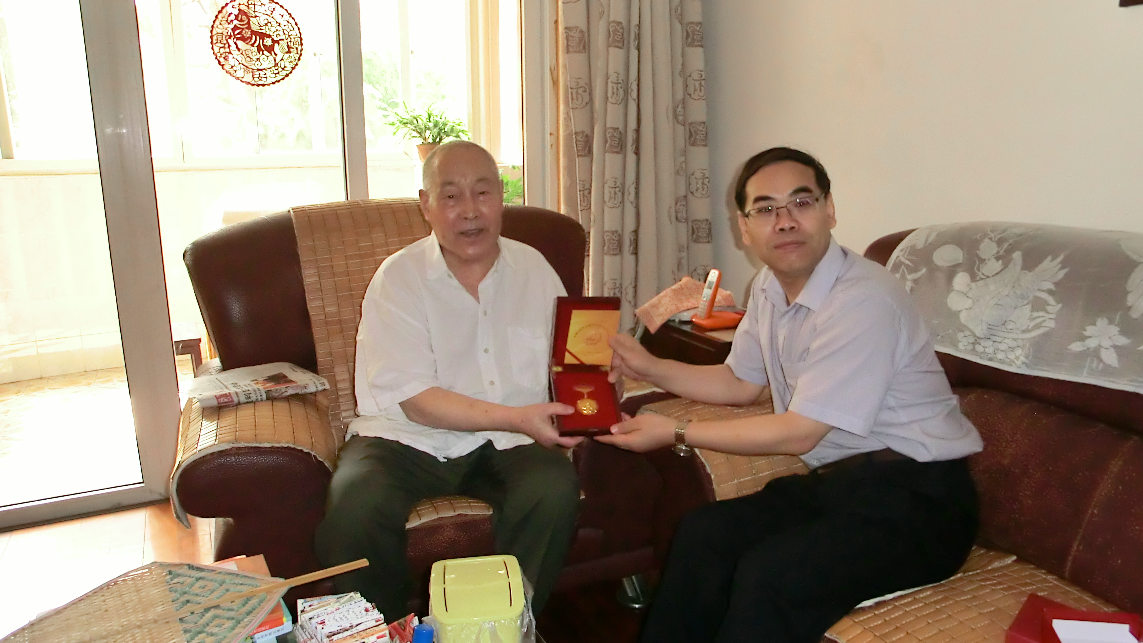8位抗战老兵均已至耄耋之年,最大的97岁高龄,最小的也已84岁。走访慰问中,每到一处,校院领导都紧紧握住老同志的手,亲切询问老同志的身体状况和生活情况,向他们致以亲切的问候和崇高的敬意;并与他们促膝交谈,一起回忆难忘的烽火岁月,共话革命精神的传承。校院领导给老同志们送上了由中共中央、国务院、中央军委发放的中国人民抗日战争胜利70周年纪念章,以及慰问金、慰问品,祝福老同志健康长寿、晚年幸福。老同志们感谢党和政府的关怀,感谢校院领导和同志们的关心,祝愿校院的明天更美好。