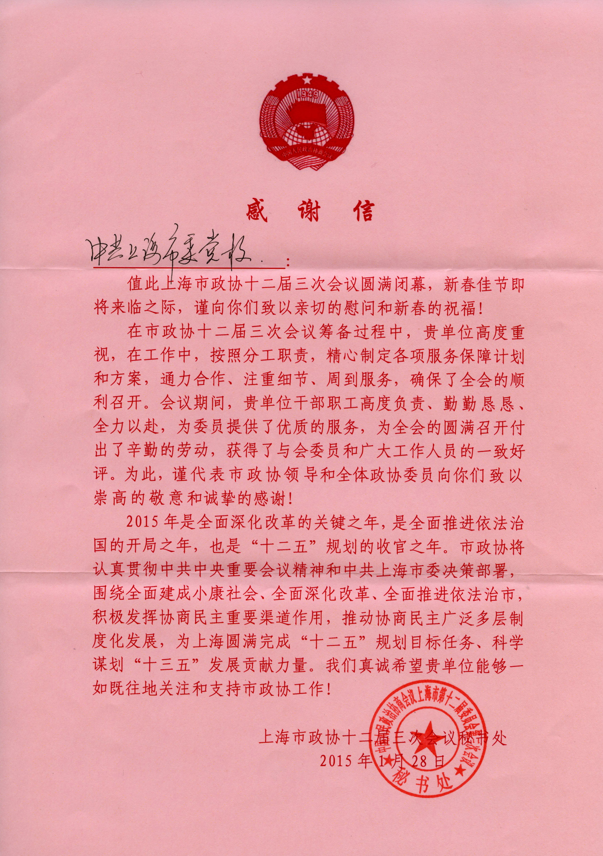 本网讯 1月28日,政协上海市委员会、上海市政协十二届三次会议秘书处分别来函,对我校院圆满完成市政协十二届三次会议的各项服务保障工作给予表彰,对我校院全体工作人员表示衷心的感谢!