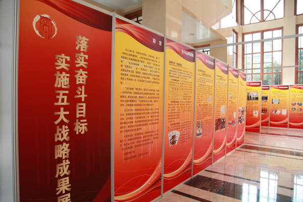 整个展览共46块展板,以图文并茂的形式,生动形象地展示了自2012年6月校委明确“38字奋斗目标”“五大实施战略”“四项工作要求”三位一体的“顶层设计”以来,校院滚动推进五大实施战略,各项工作纲举目张、扎实推进的整体情况。