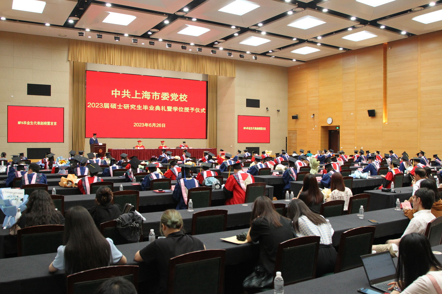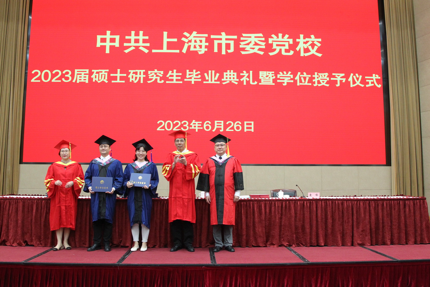 今年校(院)共计33名学术型研究生和24名MPA专业学位研究生顺利毕业并获得硕士学位。其中,15位获法学硕士学位,10位获得管理学硕士学位,4位获得哲学硕士学位,4位获经济学硕士学位,24位获公共管理硕士学位。1名学生获得国家奖学金,2名学生获评为上海市普通高等学校优秀毕业生,5名学生获评为校优秀毕业生,15名学生获优秀毕业论文奖。毕业典礼上校领导向获得优秀毕业生和优秀毕业论文的学生颁发了获奖证书。(图片由朱锋提供)
