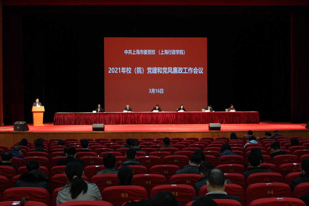 本网讯 3月16日上午,中共上海市委党校、上海行政学院在大礼堂召开2021年党建和党风廉政工作会议,对新年度党的建设和党风廉政工作作出安排部署。常务副校院长徐建刚出席会议并讲话,机关党委书记、副校院长李渤主持。市纪委监委驻市委组织部纪检监察组组长朱鸣、校委委员曾峻、朱亮高、梅丽红出席会议。全体党员近400人参会。