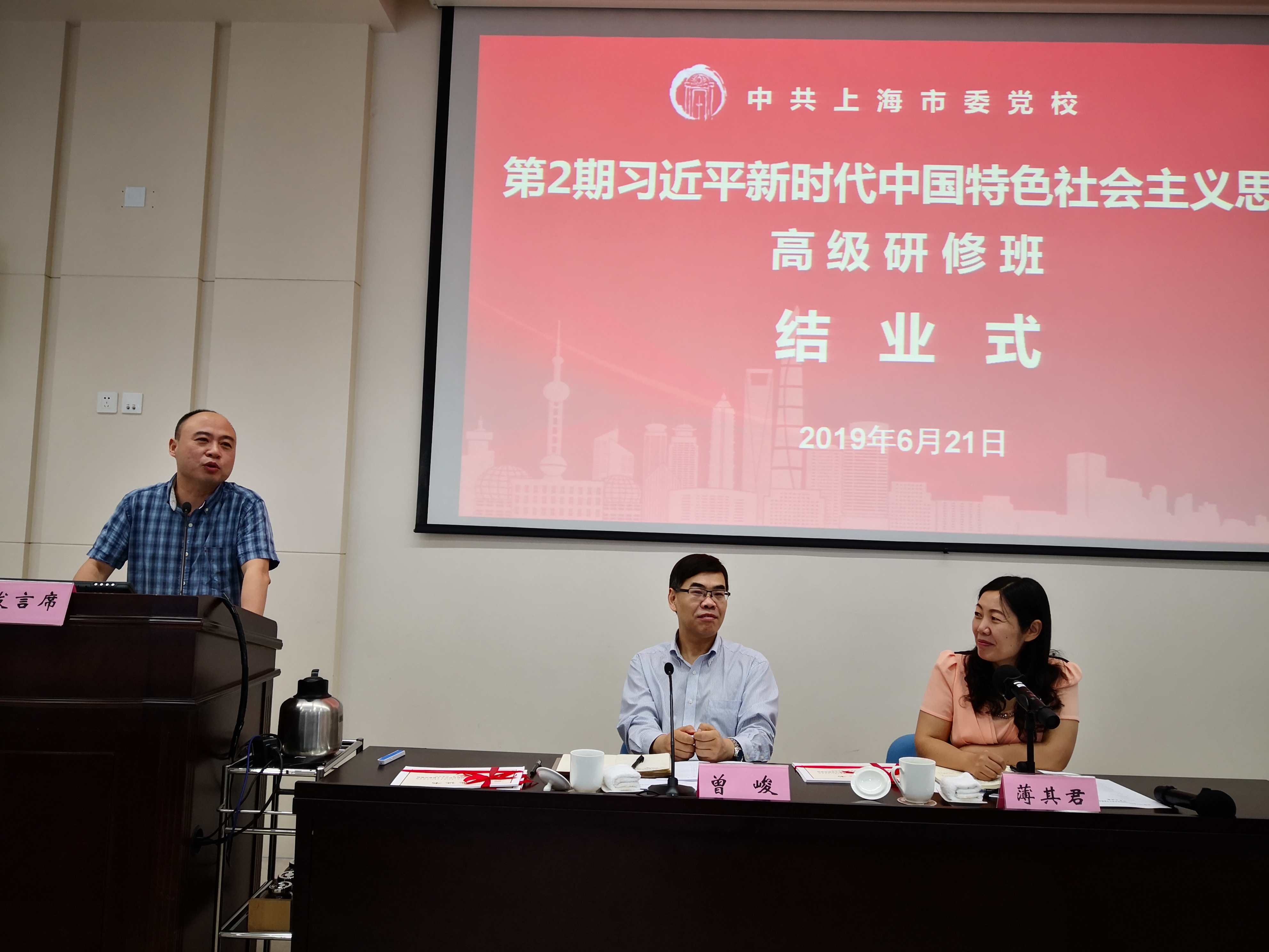 曾峻对学员们完成学习、达成培养目标表示祝贺。他重申了本次高级研修班围绕“习近平总书记与上海”主题展开学习和课程设置的定位,强调这样的设计意在将学习政治理论与有效地抓落实紧密结合。只有结合上海的实际情况,才能实际有效地抓落实、抓转化,才能深入推进上海“五个中心”建设、推进长三角一体化进程。希望学员们通过学习完成成己成人的转化,要将共产党人的理想信念转化为个人的信仰和实践;要讲好习近平新时代中国特色社会主义思想,还要将思想与实践相结合,讲好高校思想政治课;要更加深入地学习和掌握用学术讲政治,不断提高习近平新时代中国特色社会主义思想的影响力;要将学习成果体现在职业操守上,植根基层做好工作。