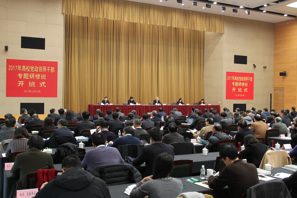 本网讯  12月19日上午,2017年高校党政领导干部专题研修班开班式在海华101报告厅举行。市委副书记、市委党校校长尹弘出席并作动员讲话,市政府副秘书长宗明主持。市委组织部副部长、市委党校副校长陈皓,市教卫工作党委书记虞丽娟、市教卫工作党委副书记、市教委主任苏明出席开班式。