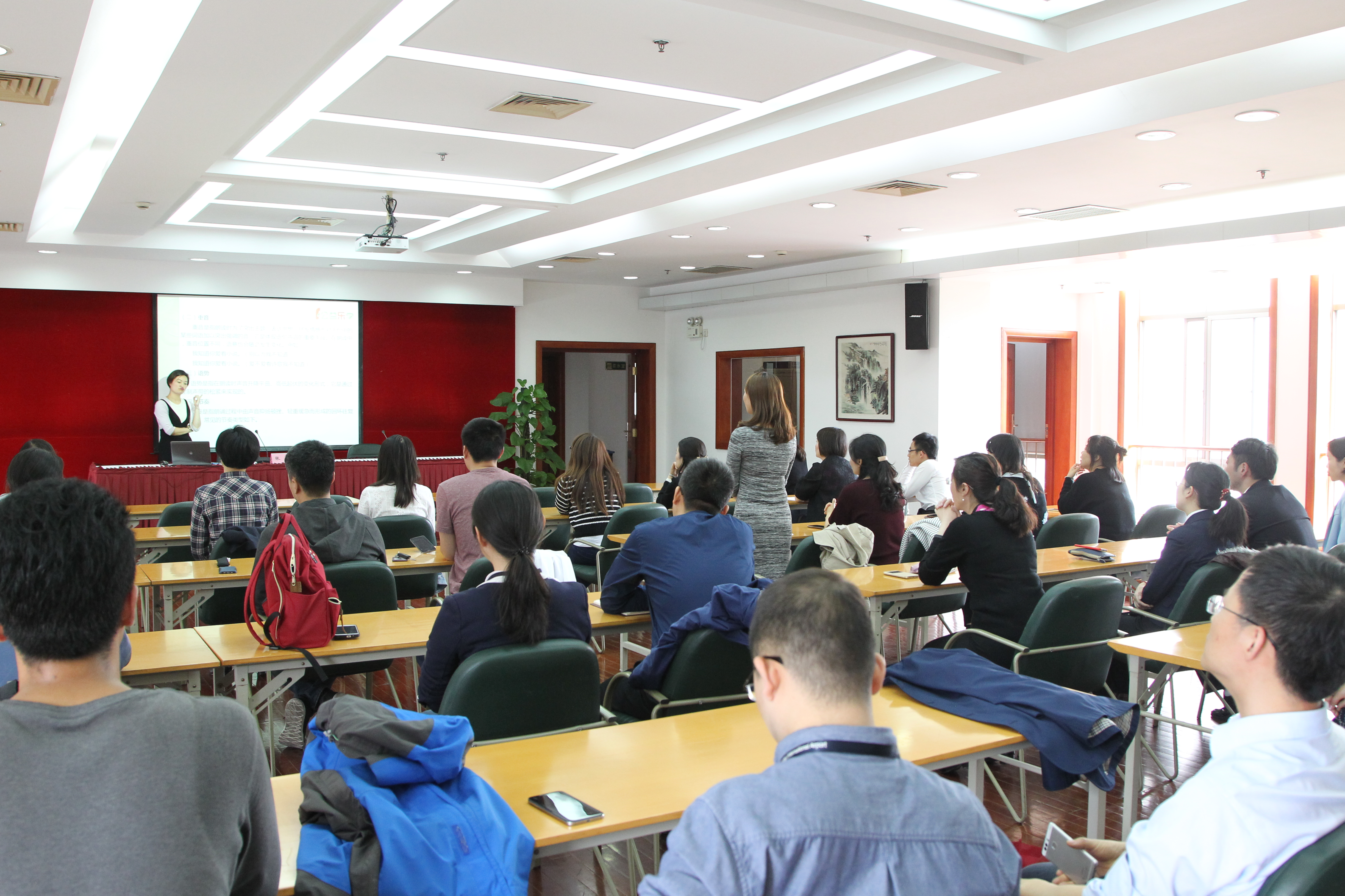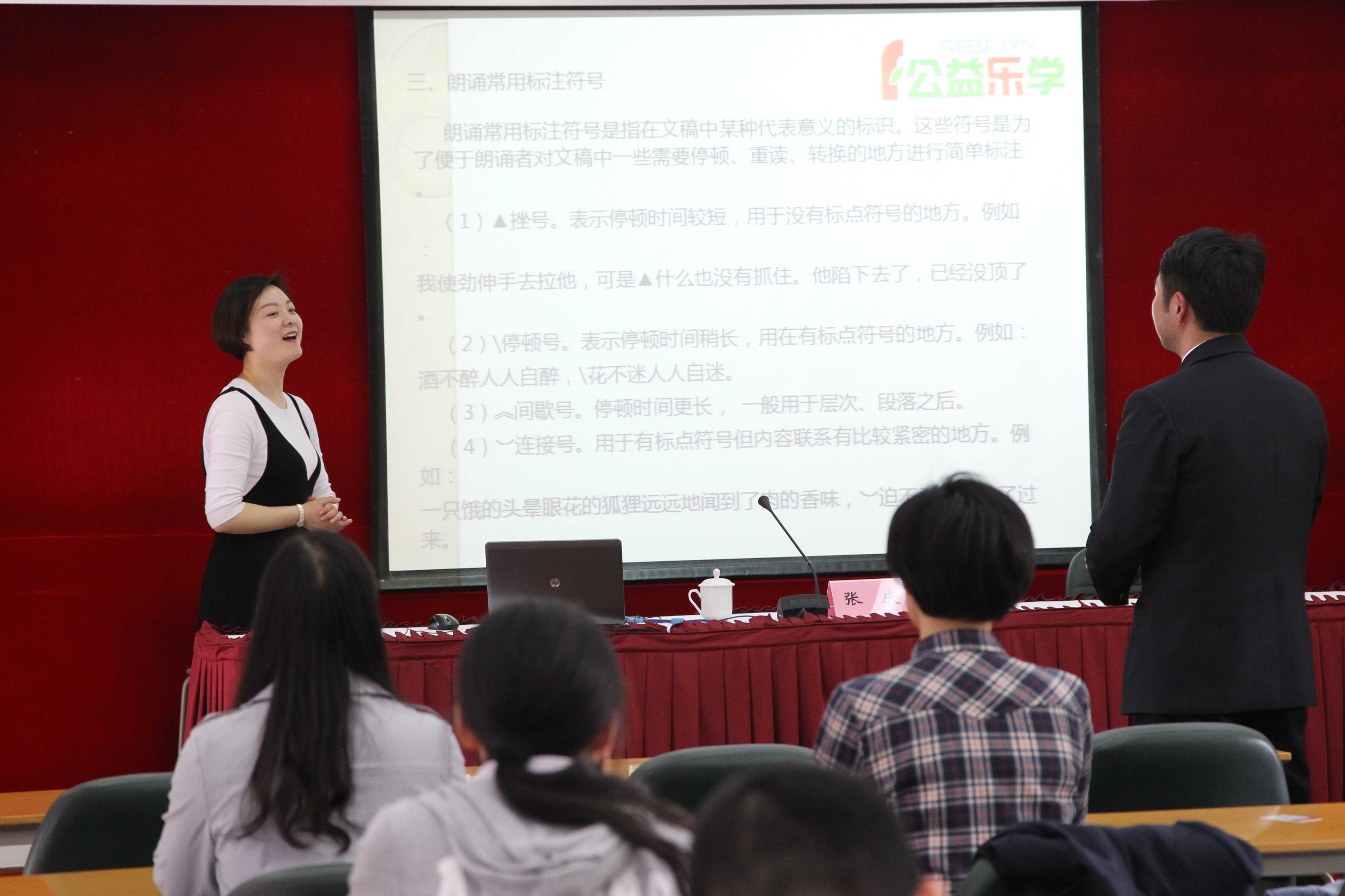 本网讯 随着央视《朗读者》节目的热播,在全社会掀起了朗读的热潮。借着这股文化清流,为提升教职工的文化素养,同时也为校园诗文朗读大会活动做预热,校工会在近日举办了“朗诵技巧入门”讲座,由市总工会“公益乐学”项目张庆老师主讲。