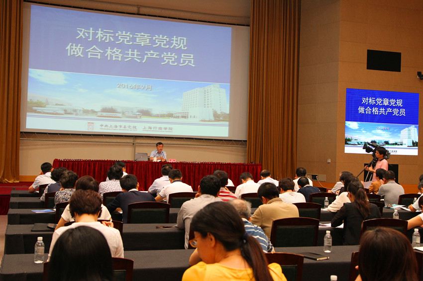 本网讯 9月13日上午,中共上海市委党校、上海行政学院在海华101报告厅隆重举行“对标党章党规 做合格共产党员”专题党课。党课由校院机关党委书记、副校院长李渤主讲,常务副校院长王国平等校院中心组成员坐第一排认真倾听、带头学习,总校、分校全体党员共450余人在现场聆听了党课。近两小时的专题党课,与会党员全程认真倾听、详细记录、仔细思考,李渤带领大家认真复习了党章、仔细研读了党规,深入学习了以习近平同志为总书记的党中央创造性提出的全面从严治党的新理念新思想新举措,教育全体党员要学党章严党纪做合格党员。党课由校院副巡视员、机关党委专职副书记、党群工作部主任董凌白主持。市纪委驻市委组织部纪检组派员参加了此次党课。