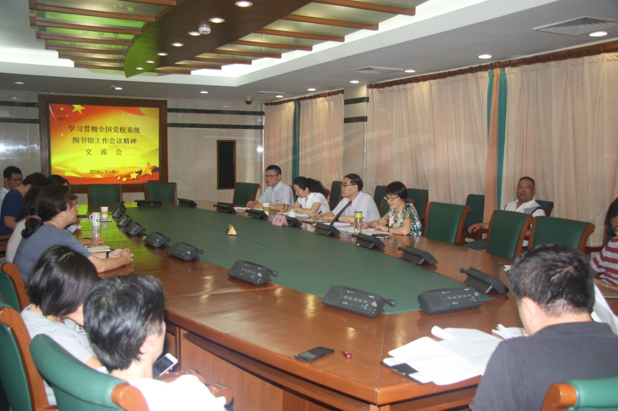 本网讯  9月8日上午,学习贯彻全国党校系统图书馆工作会议精神交流会在图书馆第一会议室召开。副校院长曾峻出席会议并讲话,图书馆馆长唐月娥主持交流会,图书馆全体人员参加。