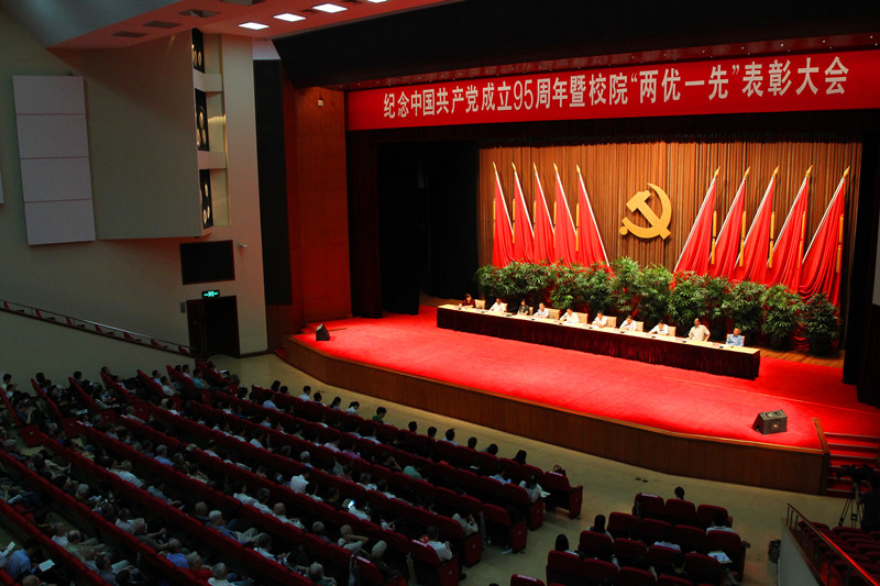 本网讯 6月28日上午,上海市委党校大礼堂内党旗飘扬,气氛庄严。9点,在全体人员齐声唱响的国歌声中,纪念中国共产党成立95周年暨校院“两优一先”表彰大会正式开始。常务副校院长王国平在会上讲话。大会由副校院长李渤主持,副校院长郭庆松宣读了校院“两优一先”表彰决定,校委领导为校院“1+5”层面全体“两优一先”集体和个人颁发了获奖证书。全体校委委员、校院全体在职党员、研究生党员及部分离退休党员共600余人参加了大会。