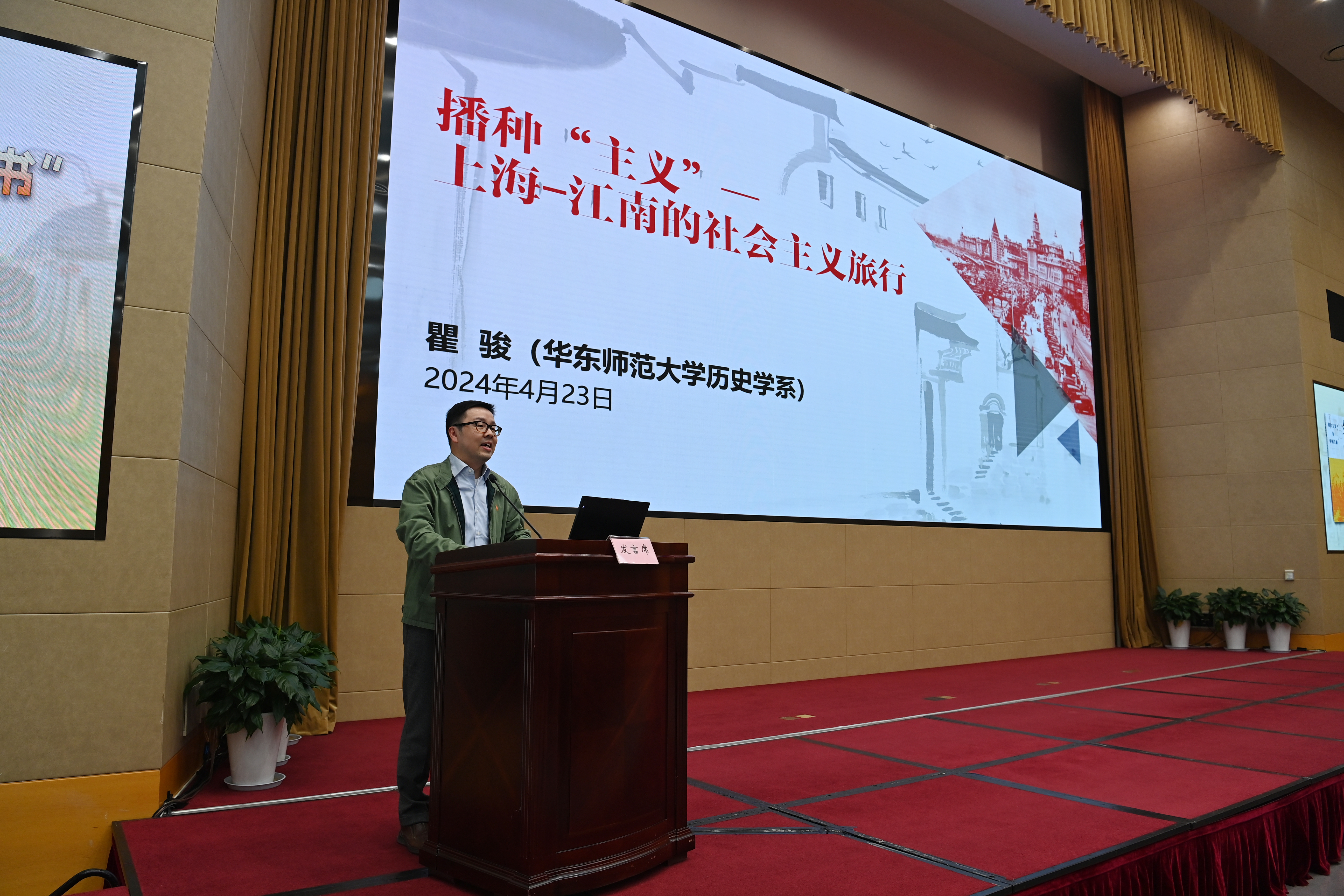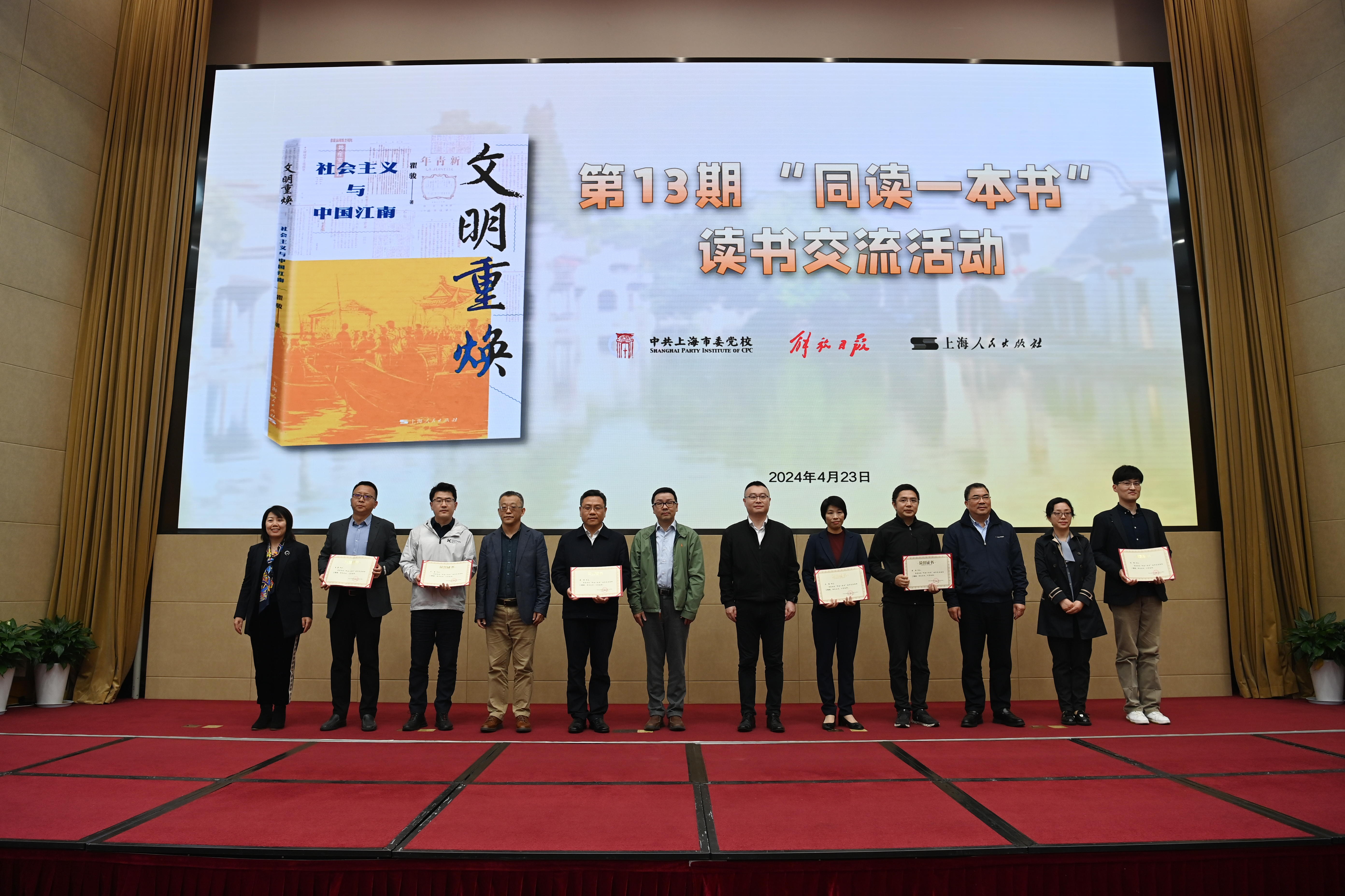 本网讯 4月23日下午,校(院)举办第13期“同读一本书”读书交流活动。本次读书交流活动选取《文明重焕:社会主义与中国江南》一书,特邀该书作者华东师范大学历史学系党委书记瞿骏教授出席活动并发表演讲。市委党校副校长戴冰、上海人民出版社党委书记、社长温泽远、市委组织部干部教育处副处长、二级调研员施耀庭、上海人民出版社副总编辑鲍静等出席活动。