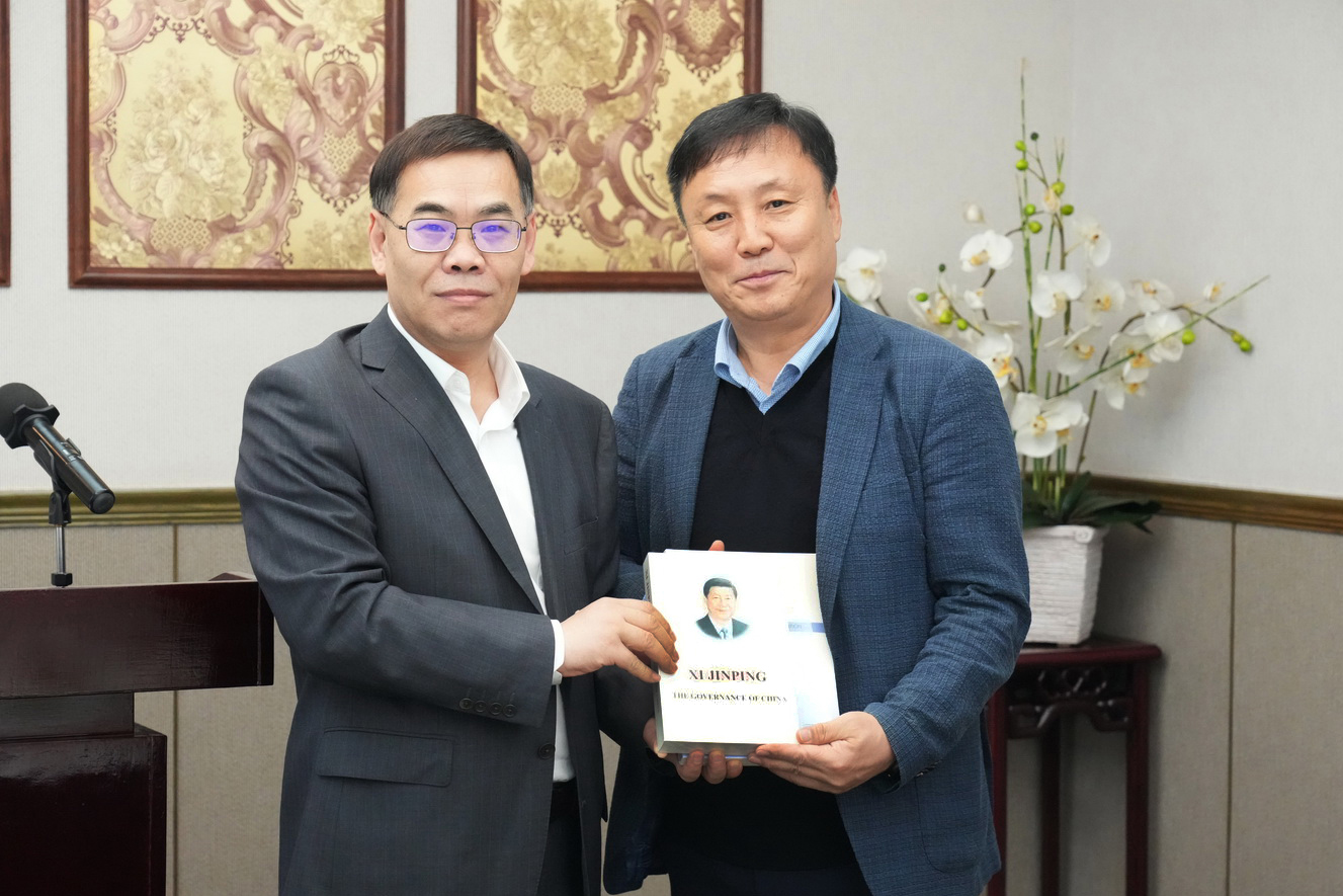 朱宰福感谢校(院)热情款待。朱宰福介绍了韩国地方行政研究院的组织架构、研究项目、国际合作等,盛赞校(院)现代化教学设施和科学培训体系。朱宰福表示,今年是韩国地方行政研究院建院40周年,希望两院深度交往为中韩友好做出应有贡献。双方还就续签谅解备忘录、合作项目等进行了深入交流。