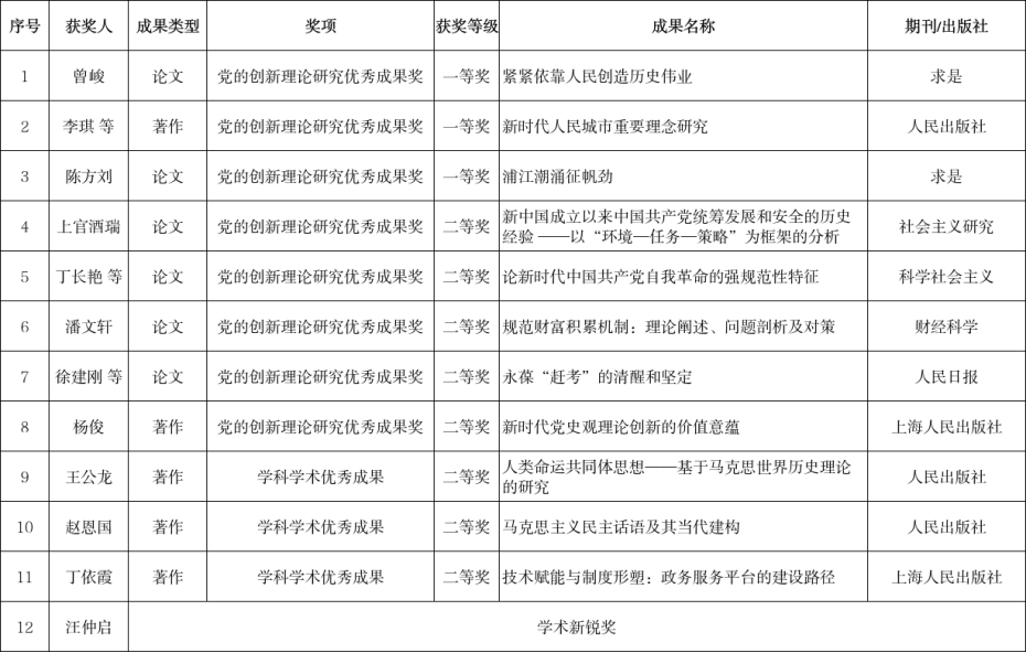 本次荣获“党的创新理论研究优秀成果奖”一等奖的3项成果分别为,曾峻教授撰写的论文《紧紧依靠人民创造历史伟业》,陈方刘教授撰写的论文《浦江潮涌征帆劲》,李琪教授等撰写的专著《新时代人民城市重要理念研究》。上官酒瑞教授撰写的论文《新中国成立以来中国共产党统筹发展和安全的历史经验 ——以“环境—任务—策略”为框架的分析》等成果荣获党的创新理论研究优秀成果二等奖。王公龙教授撰写的专著《人类命运共同体思想——基于马克思世界历史理论的研究》等成果荣获学科学术优秀成果二等奖。