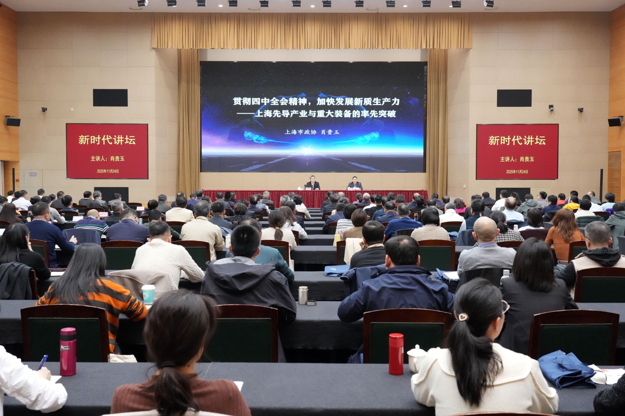 11月24日下午,市政协副主席、党组副书记肖贵玉来校主讲新时代讲坛,作“贯彻四中全会精神,加快发展新质生产力——上海先导产业与重大装备的率先突破”专题报告。常务副校长曾峻主持报告会。