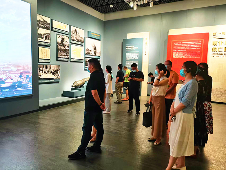 党员们顶着烈日,怀着无比崇敬的心情从纪念馆正门口进入地面层大厅,迎面就看到巨幅壁画,上面展现了天安门、延安宝塔和西柏坡等标志性地点。巨画正上方印刻镰刀锤头的党徽。大厅两侧也有大型壁画,分别是蜿蜒长城与黄河巨浪,感觉十分豪迈!随后,党员们跟着讲解员沿着巨幅壁画侧后方的扶梯进入地下展厅。在扶梯上,一抬头就可见由闪亮灯管映出的一大会址石库门建筑轮廓及党徽,一种庄重感扑面而来。进入地下展厅,大家依次参观了序厅、“前仆后继、救亡图存”“民众觉醒、主义抉择”“早期组织、星火初燃”“开天辟地、日出东方”“砥砺前行、光辉历程”及尾厅共7个板块。看着一件件饱经沧桑的珍贵史料,一张张定格历史的资料照片,一个个再现原貌的模拟场景,每一位党员都久久驻足,大家时而庄重凝视、时而低声交流、时而感慨万分,细细体会其中的光荣与辉煌。
