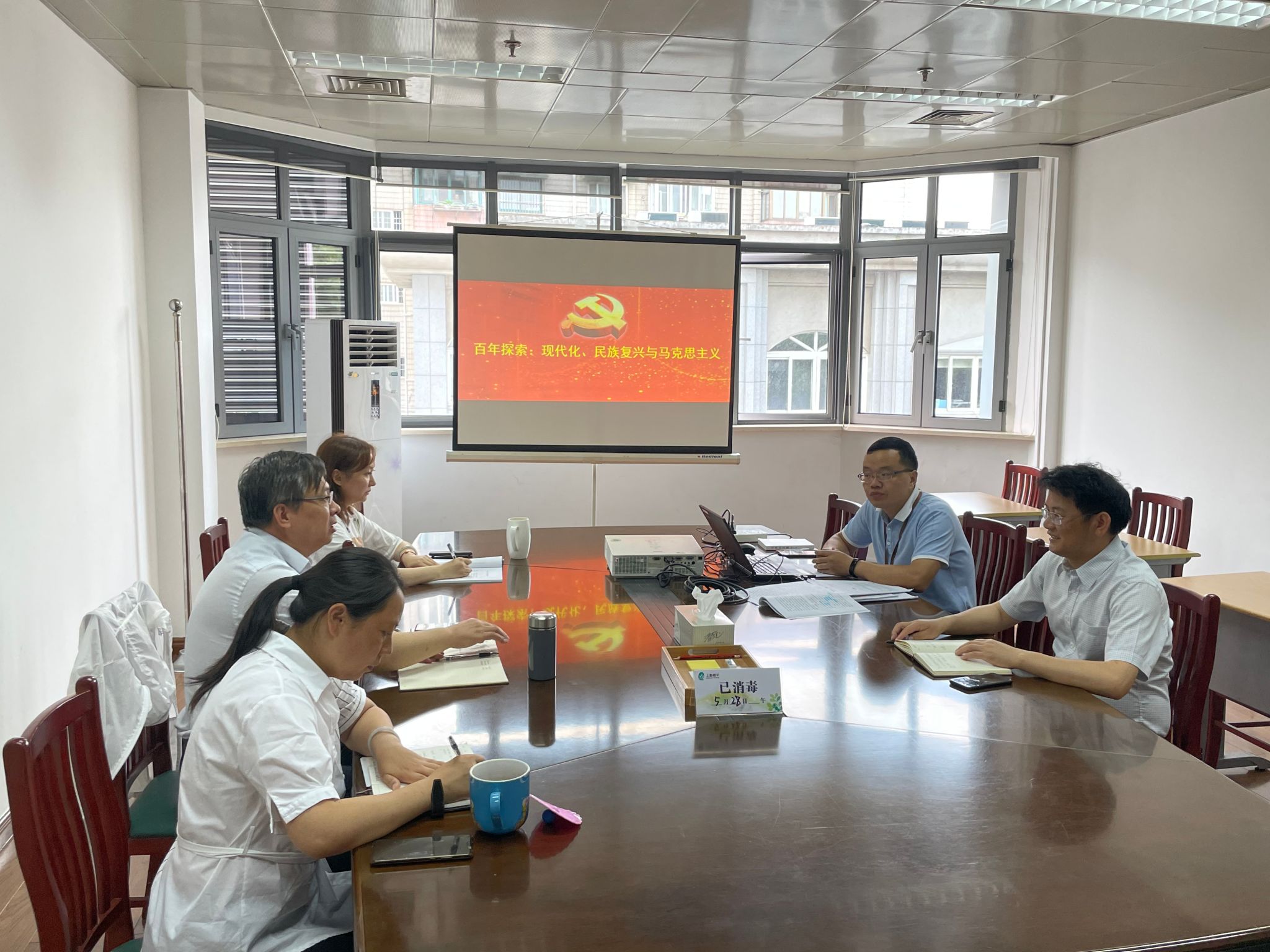 本网讯 5月28日,监察审计室党支部围绕“学党史、悟思想、办实事、开新局”开展主题党日学习活动。活动由机关纪委书记、监察审计室党支部书记沈国勤主持,王守拙给大家上了一堂题为“百年探索:现代化、民族复兴与马克思主义”的党课,支部全体党员参与了学习交流。