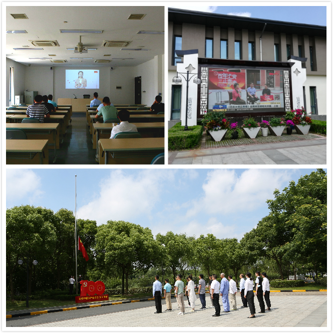 课程视频在校区教学楼广场大屏同步播出,方便学员课间及课后收看。课程开始前,校区党员干部及物业主管以上同志举行升国旗仪式,奏唱国歌,在火红的建党100周年庆祝标志立牌前,感悟初心使命。
