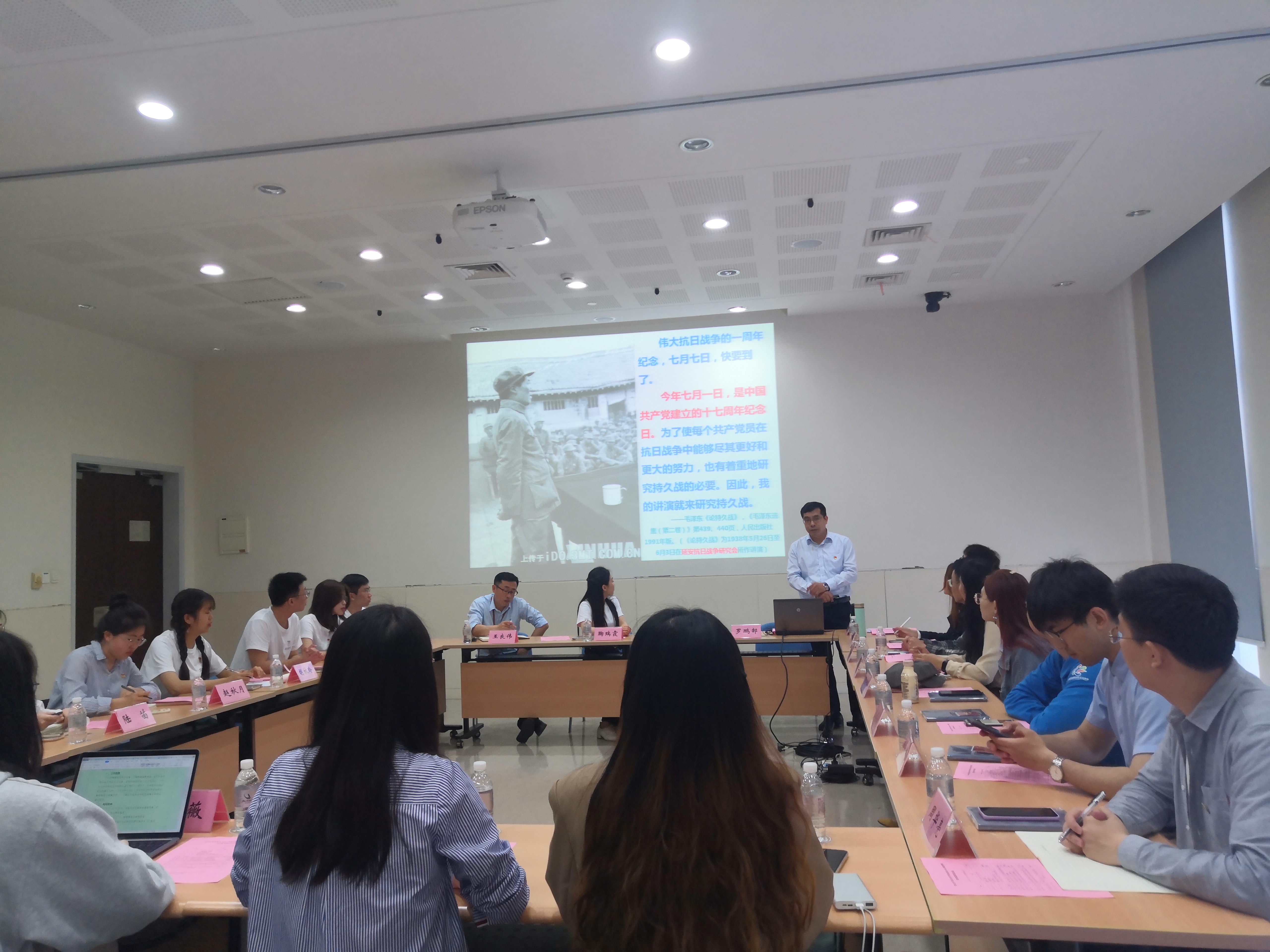 本网讯 为深入贯彻习近平总书记关于开展党史学习教育的重要讲话精神,落实团市委关于各学校开展党史宣讲活动的要求,5月15日上午,我校研究生党史宣讲团与同济大学习近平新时代中国特色社会主义思想学习研究会(以下简称“习研会”)以及团委时代声音传播社(以下简称“时代声音”)在海华楼202教室举行了交流会。研究部副主任罗鹏部致辞,研究生党支部、研究生团总支、研究生会、“党样青春”编辑部、爱心协会、明德书友会等学生组织的代表以及部分研究生参加会议。
