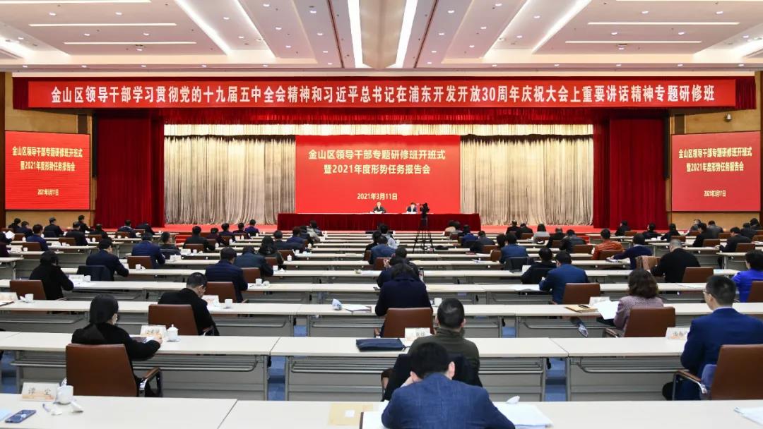 本网讯 3月11日,金山区领导干部学习贯彻党的十九届五中全会精神和习近平总书记在浦东开发开放30周年庆祝大会上重要讲话精神专题研修班开班式在金山区会议中心举行。区委书记胡卫国出席开班式并做形势任务报告。