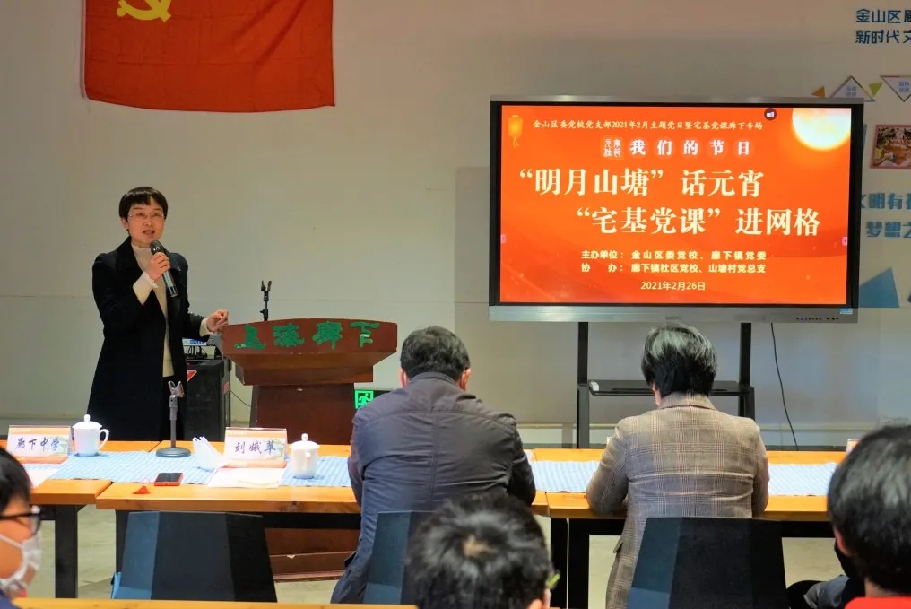 本网讯 为学习贯彻落实中央、市委、区委党史学习教育动员会精神,2月26日下午,由金山区委党校、廊下镇党委主办,廊下镇社区党校、山塘村党总支协办的“‘明月山塘’话元宵、‘宅基党课’进网格”主题党日活动在山塘村青檐版画艺术中心举行。金山区委党校常务副校长孙秀强,副校长郜工农、刘娥苹,廊下镇党委副书记周春芳,党委委员苏鹏、俞惠锋出席活动。廊下镇社区党校、沪浙山塘联合党支部党员代表、廊下中学党支部及学生代表、区委党校全体党员等50余人参加活动。