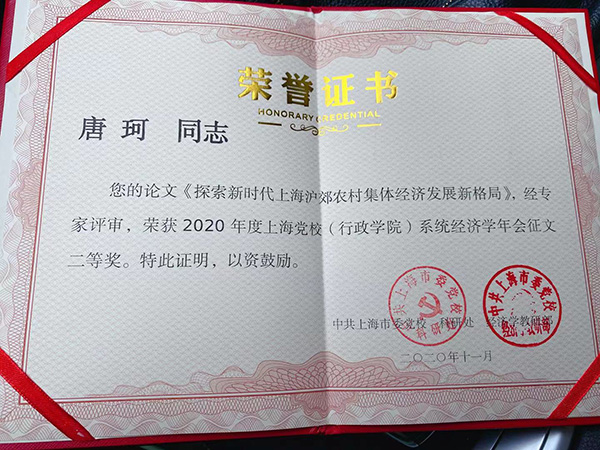本网讯 11月24日,上海市委党校(行政学院)主办“构建新发展格局与‘十四五’高质量发展”研讨会。金山区委党校课题组撰写的《关于上海浦南地区一体化发展的调查研究》荣获2020年度上海党校(行政学院)系统经济学年会一等奖。青年教师唐珂撰写的《探索新时代上海沪郊农村集体经济发展新格局》荣获二等奖。