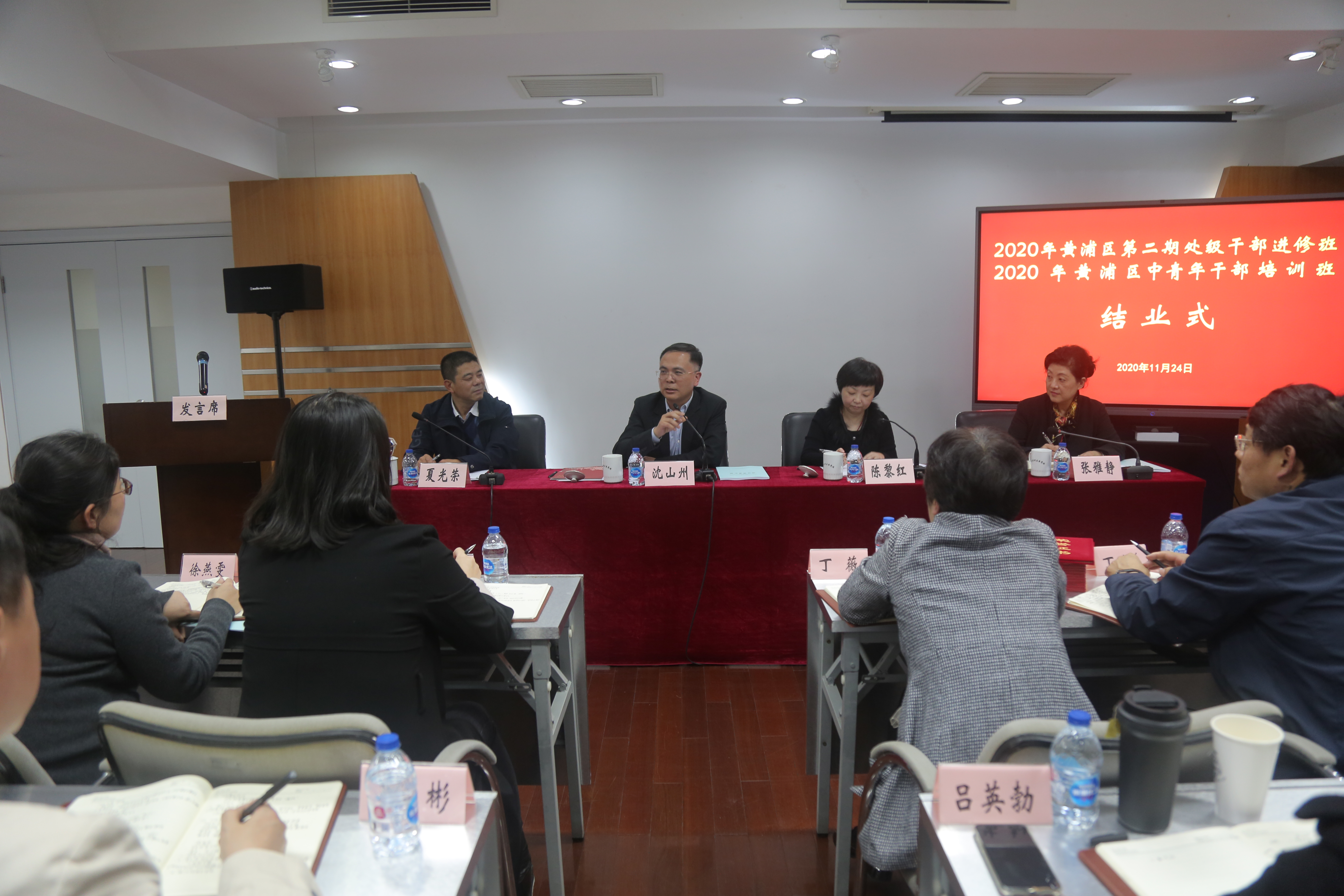 本网讯 11月24日,2020年黄浦区第二期处级干部进修班、中青年干部培训班在区委党校举行结业式,区委副书记、党校校长沈山州出席并讲话。结业式由区委党校常务副校长陈黎红主持,区委党校副校长夏光荣作培训总结。6位学员代表作交流发言。
