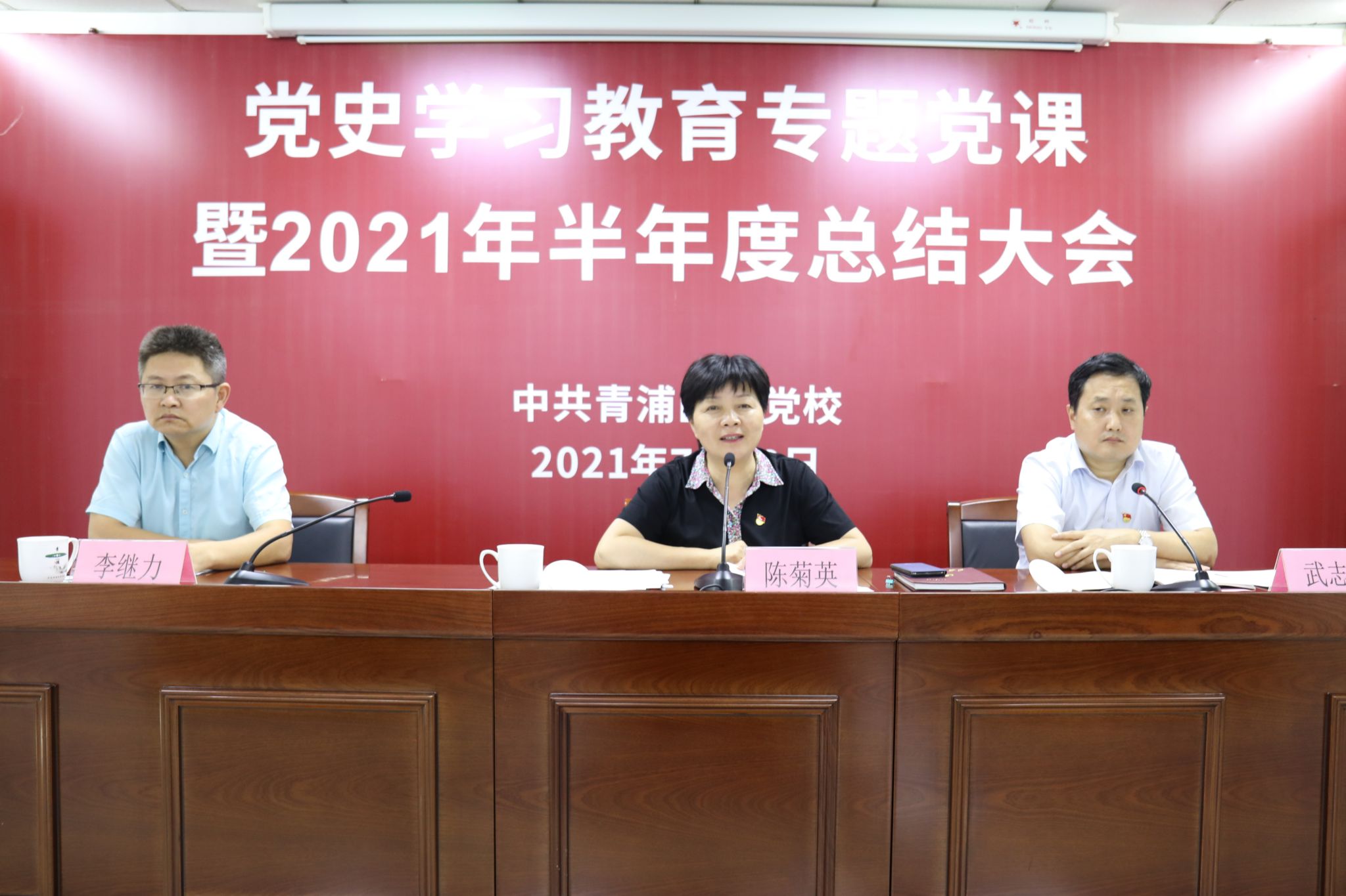 本网讯 7月19日下午,青浦区委党校举行党史学习教育专题党课暨上半年度工作总结会。常务副校长陈菊英为全体教职员工上党史学习教育专题党课并作半年工作总结,副校长武志华主持,全体教职员工以及物业公司代表参加。