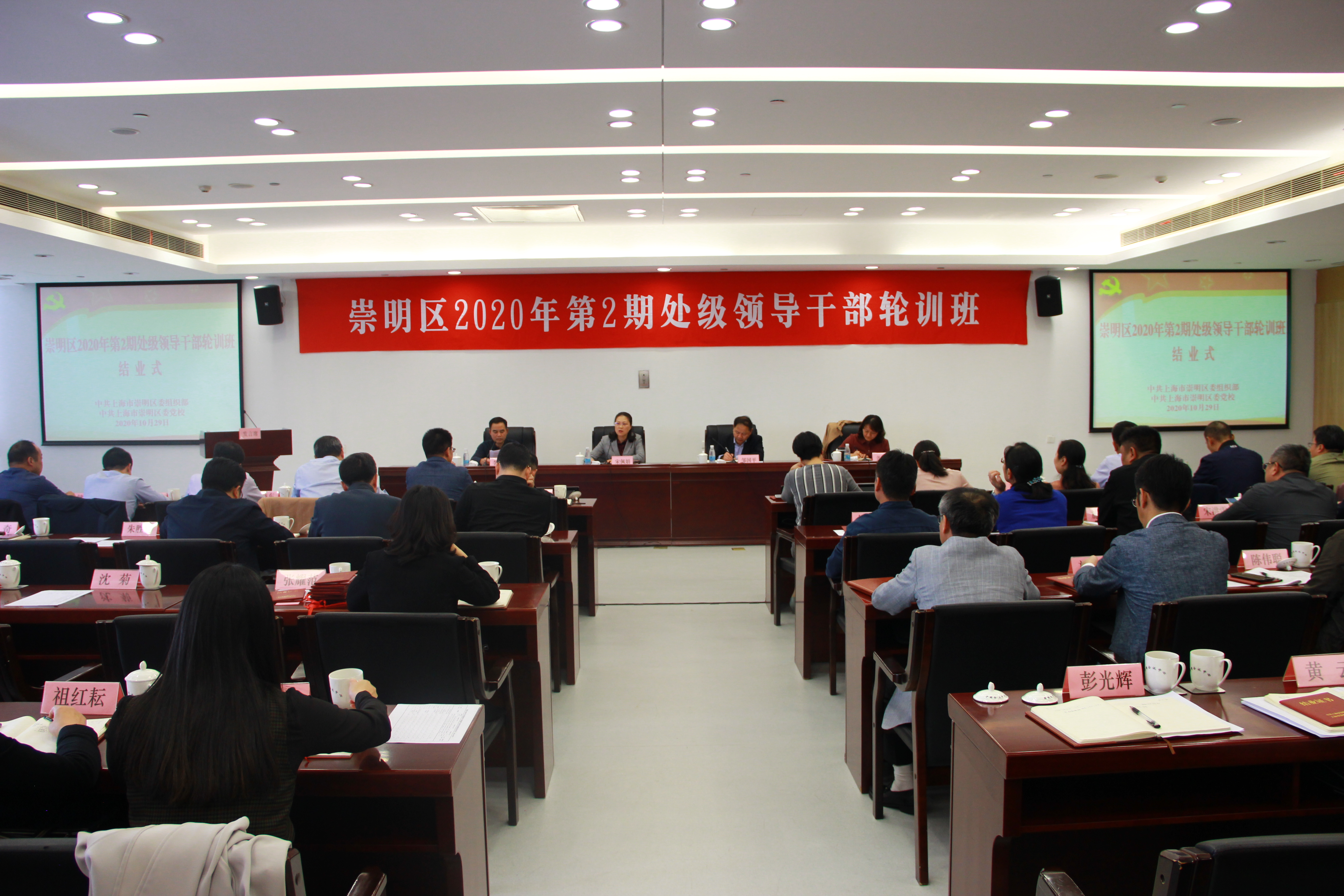 本网讯 10月29日下午,崇明区2020年第2期处级领导干部轮训班在区会议中心309室举行结业式。区委党校常务副校长宋佩娟、区委组织部辅导员邹国平、区委党校副校长李尧新、区委编办副主任、组织部干部科科长龚胜瑜出席结业式,区委党校副校长李尧新主持。