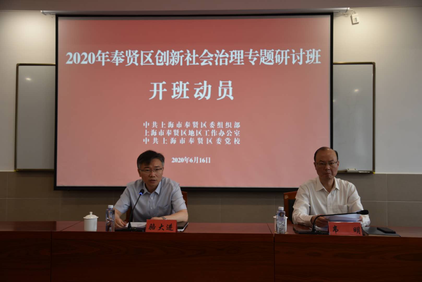 本网讯 6月16日上午,2020年奉贤区创新社会治理专题研讨班在区委党校开班。奉贤区委副书记骆大进出席开班式并讲话。区委常委、组织部部长、区委党校校长韦明主持开班式。