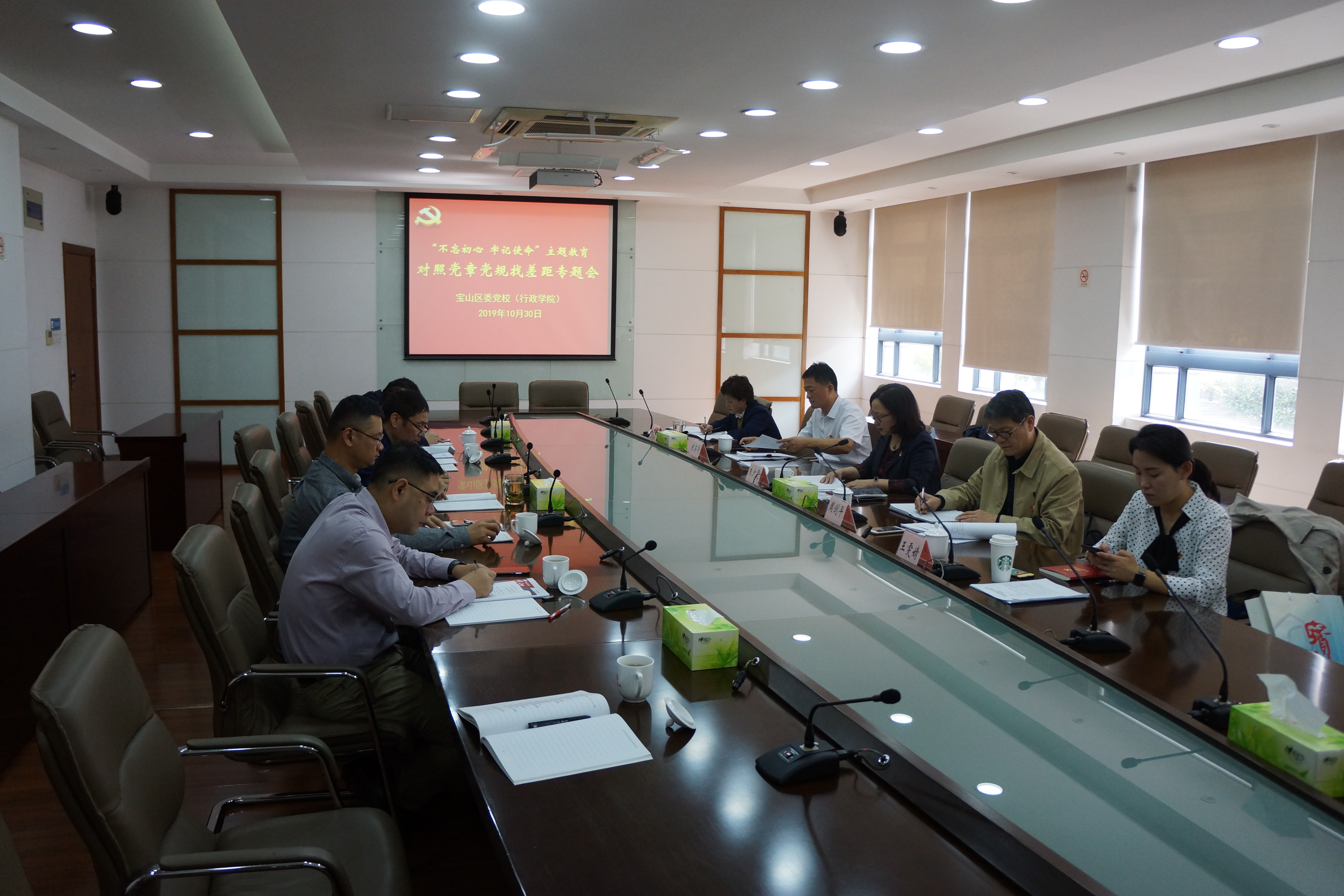 本网讯 10月30日,宝山区委党校(行政学院)召开对照党章党规找差距专题会议。区委“不忘初心、牢记使命”主题教育第六指导组组长周剑平出席会议并全程指导。区委党校(行政学院)常务副校院长朱少雯主持。区委党校(行政学院)领导班子成员及各科室负责同志参加,指导组王雯婧列席。