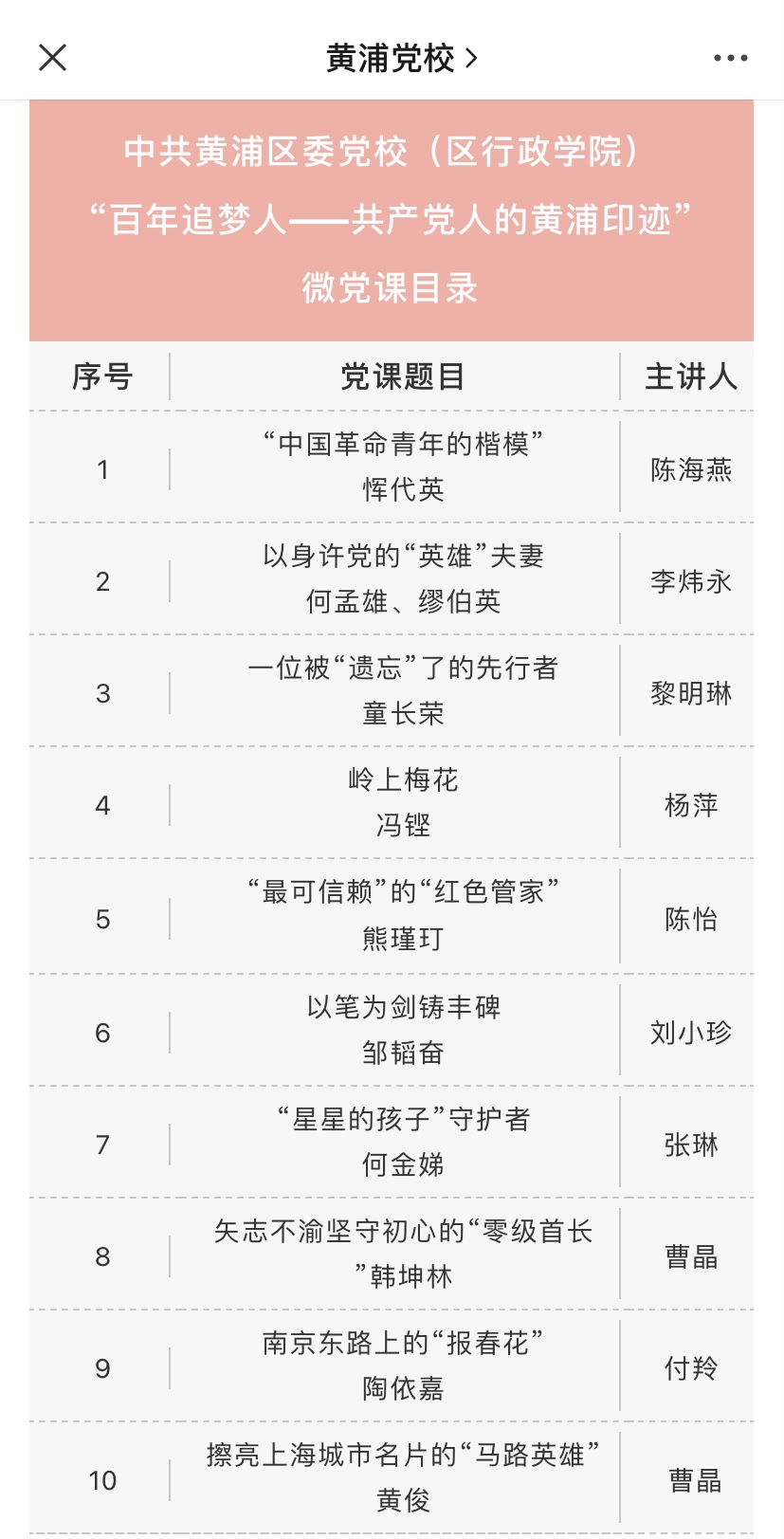 截止目前,区委党校已完成10门微党课的录制工作,并依托“黄浦党校”微信公众号平台在“七一”前陆续推出。已上线《“中国革命青年的楷模”恽代英》《以身许党的“英雄”夫妻何孟雄、缪伯英》《一位被“遗忘”了的先行者:童长荣》《岭上梅花 冯铿》4堂微党课,先后被学习强国上海平台、上观新闻、澎湃新闻、新浪网、网易新闻、上海黄浦、黄浦党建等媒体平台转载。前期录制的聚焦黄浦“首发首创”“四史”学习教育系列微党课也被共产党员网、上海基层党建网转载。