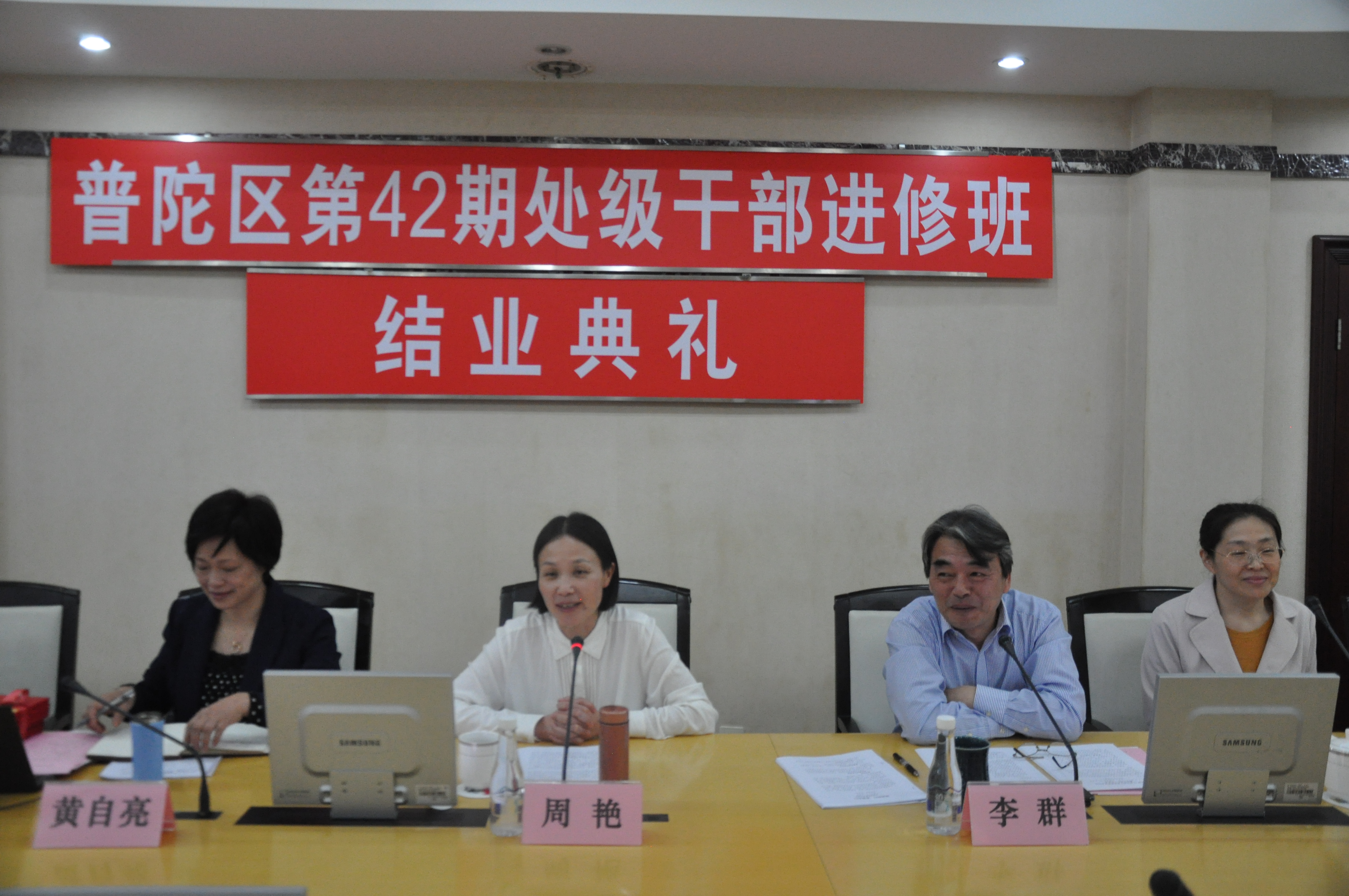 结业典礼由区委党校常务副校长李群主持。普陀区第42期处级班临时党支部书记黄自亮作支部工作小结,带领大家回顾总结了在党校培训期间加强理论学习与加强党性锻炼的情况。左如军等6名学员代表分别作汇报交流。周艳为学员颁发了结业证书。