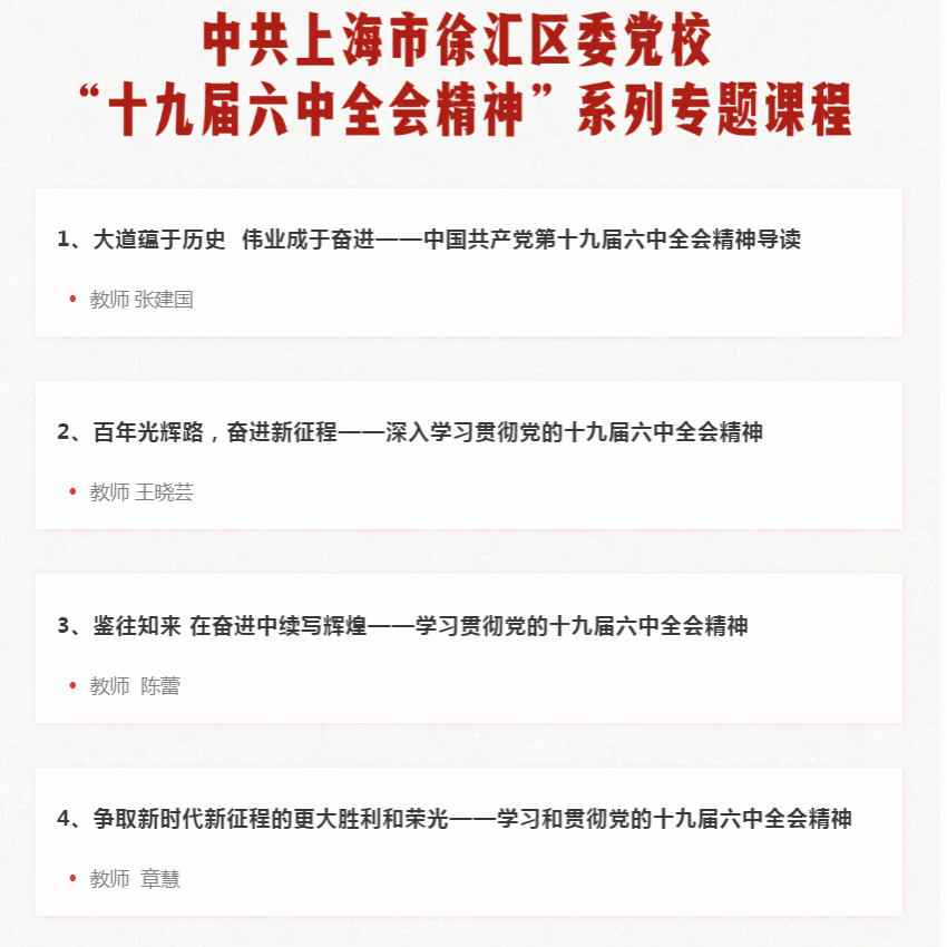 为深入学习宣传贯彻党的十九届六中全会精神,教育引导徐汇区党员干部坚定理想信念、筑牢初心使命,自觉把思想和行动统一到全会精神上来,统一到新征程创造新奇迹、展现新气象的奋斗上来,统一到全面建设“卓越徐汇”的奋斗目标上来,区委党校推出“学习贯彻党的十九届六中全会精神”专题课程清单。内容如下:(见图片)
