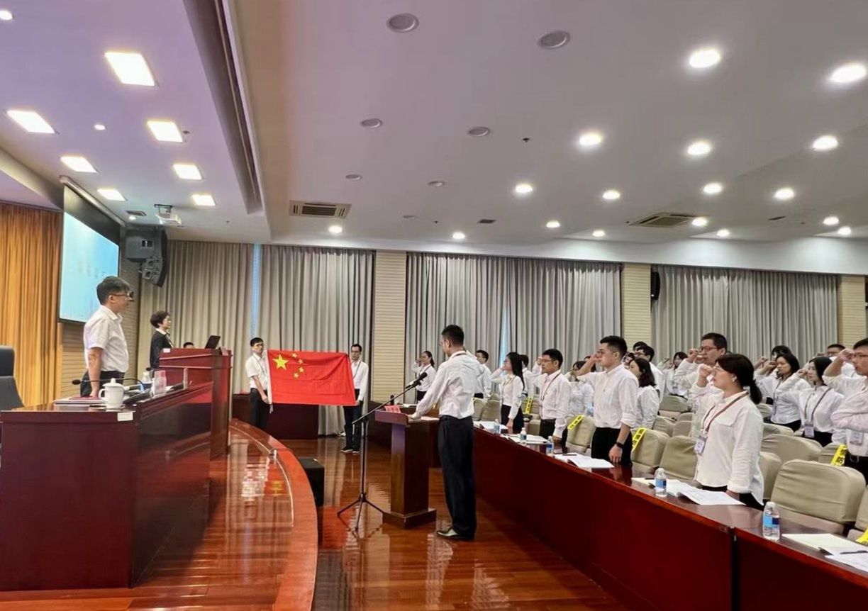 开班式上,66名新任职科级领导干部举行了庄严的入职宣誓仪式。领誓人手抚宪法,领诵誓词,全体学员面向国旗,郑重宣誓,施冬云监誓。