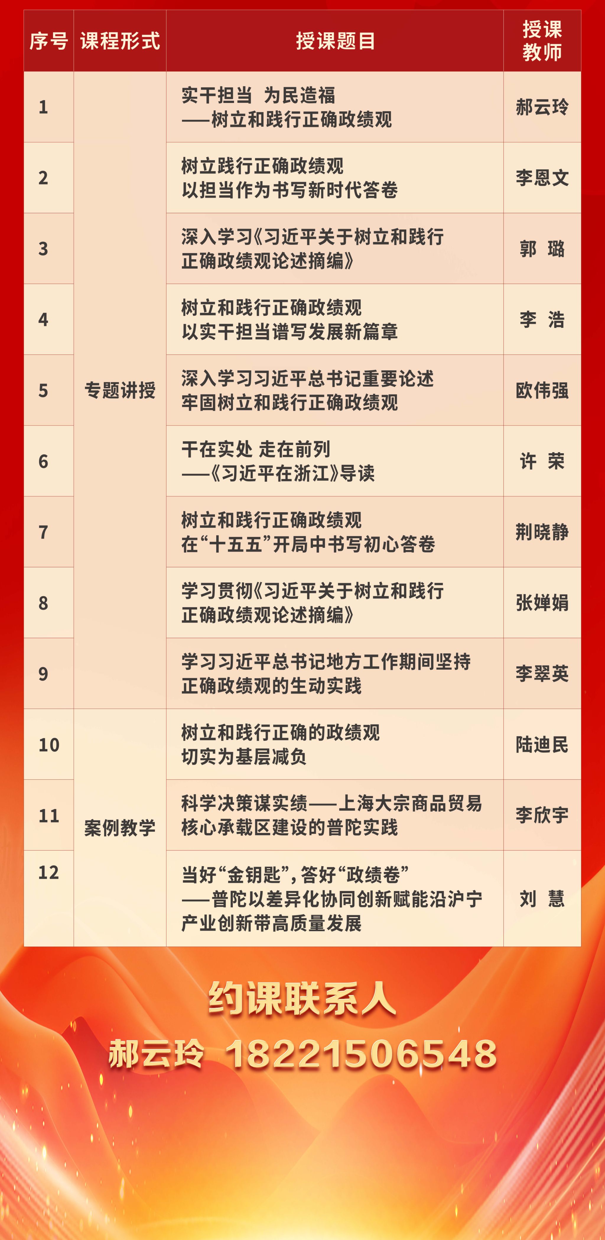 党中央决定在全党开展树立和践行正确政绩观学习教育,这是今年党的建设的重要任务。为深入学习贯彻习近平总书记关于树立和践行正确政绩观的重要论述,充分发挥党校理论宣传主渠道主阵地作用,普陀区委党校现推出“树立和践行正确政绩观”课程清单,欢迎各单位预约点课。
