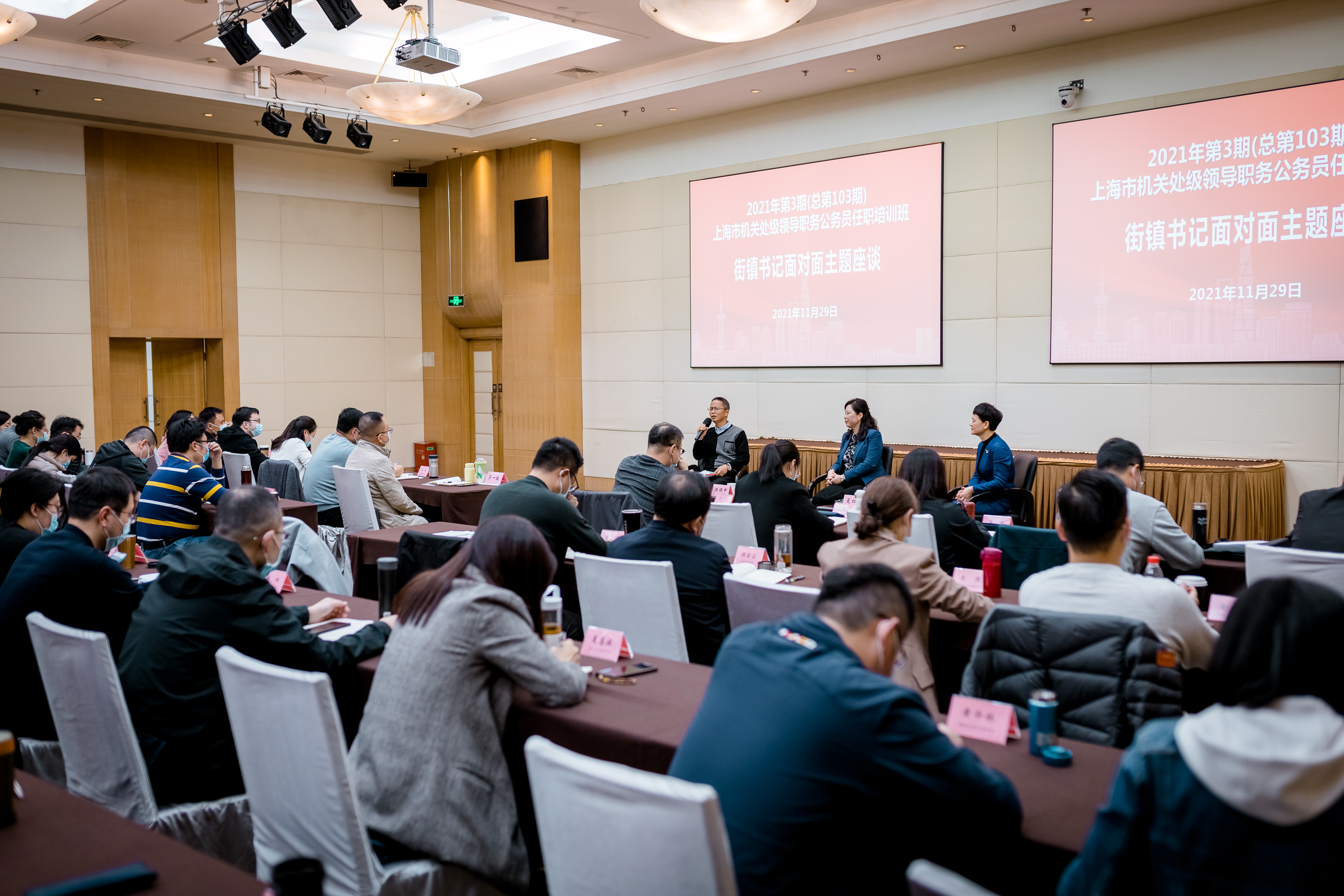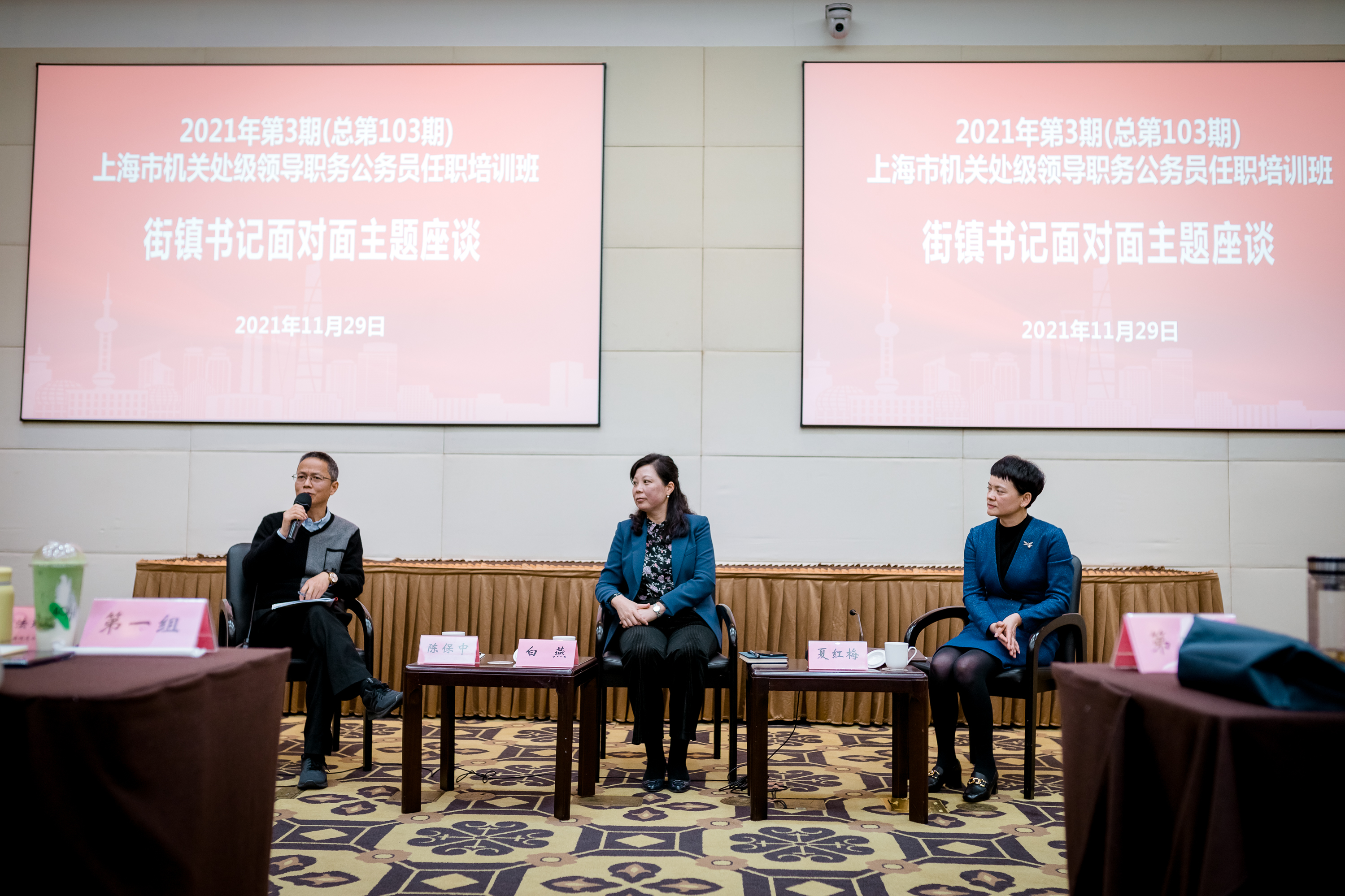 本网讯 11月29日下午,我校特邀长宁区华阳路街道党工委书记白燕与金山区朱泾镇党委书记夏红梅,与第103期处级公务员任职培训班学员们齐聚海兴楼201室开展面对面畅谈。座谈会由我校公共管理教研部陈保中教授主持。
