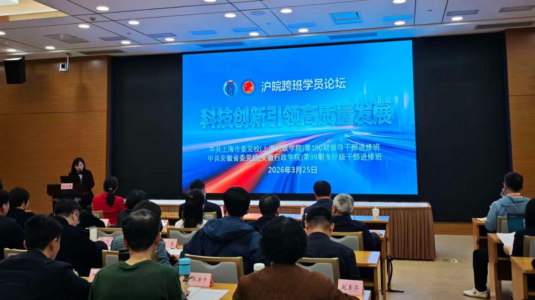 在沪皖跨班学员论坛上,安徽省委党校第99期市厅级干部进修班与上海市委党校第150期领导干部进修班全体学员齐聚一堂,结合工作实际,围绕“科技创新引领高质量发展”开展主题发言。上海市委党校副校长王永杰、安徽省委党校教育长张超出席论坛并发表讲话,上海市委党校经济学教研部刘志广教授作专家点评。互动交流环节,双方学员积极提问,答疑详实具体、交流坦诚深入,现场气氛热烈、思维碰撞频繁,实现了经验互鉴、理念互通。