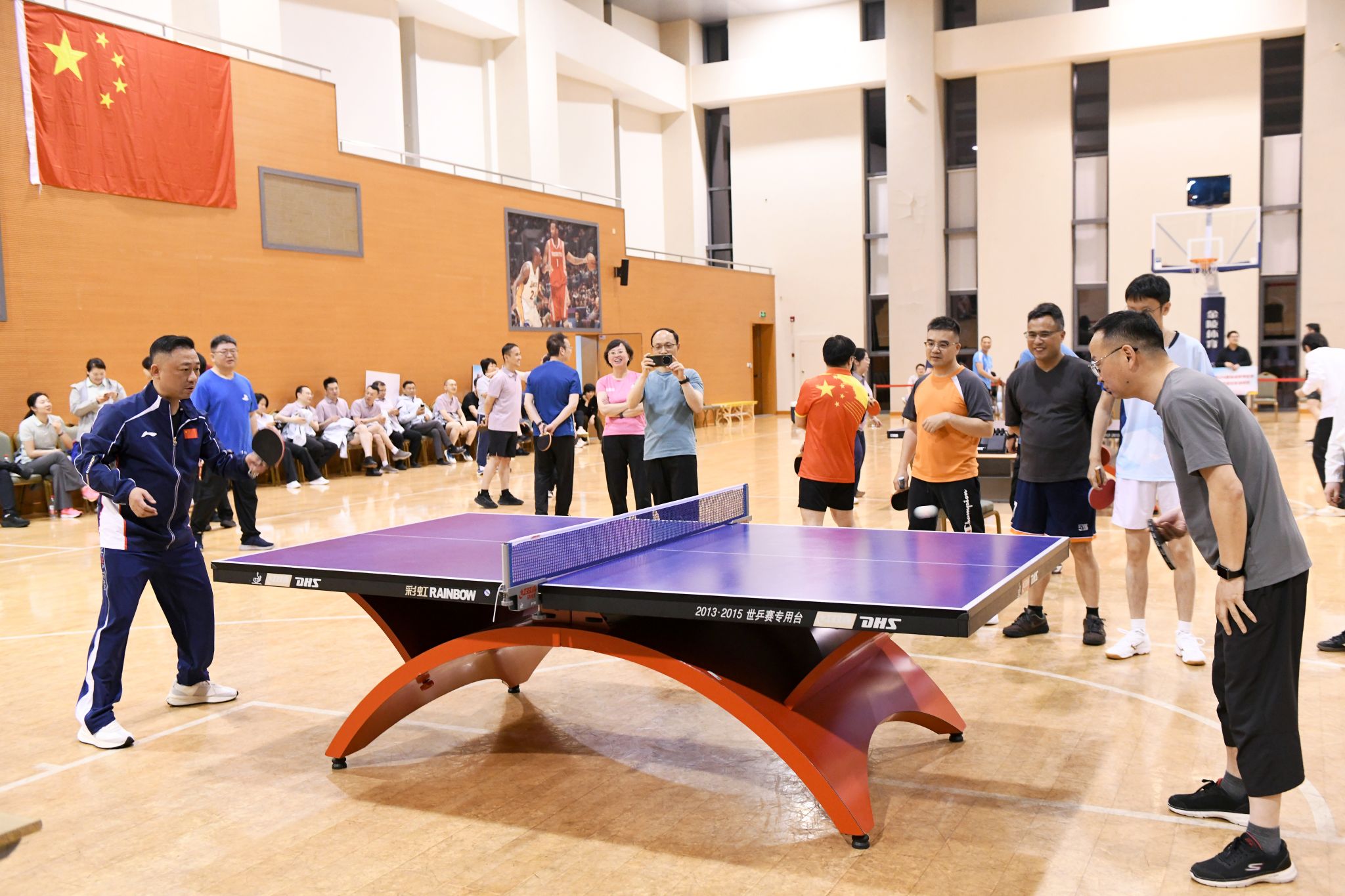 比赛采用混合团体赛制,分小组循环赛和同名次决赛两个阶段。赛场上,选手们或精准扣杀,或巧妙防守,或飞身救球,将力量与技巧融为一体。奥运冠军阎森、世界冠军张德英不时为选手们支招,赵子豪更是上场与学员切磋,引得全场沸腾。场边,啦啦队呐喊声此起彼伏,“友谊第一、比赛第二”的温馨场面贯穿始终。