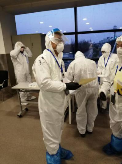 一张桌子,几把椅子,12小时夜班,休息24小时,再战12小时白班,范矿生上岗第一天就开启了这样的“hard”模式。裹着密不透风的防护服、戴着护目镜和手套,被汗水浸透的湿漉漉的衣服和头发紧贴身体,从额头上滚落下来的汗水往往会流进嘴里,加上被雾化却不能伸手去擦的近视眼镜和护目镜,非常不舒服。这位80后的山东大汉坦言“有些难熬”。“里面套了一件羽绒服,当深夜脱下防护服时,早已被汗水浸透的身体被深夜的冷风一吹,透心凉。”